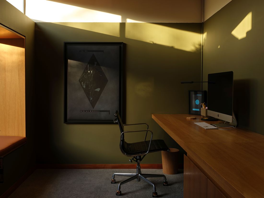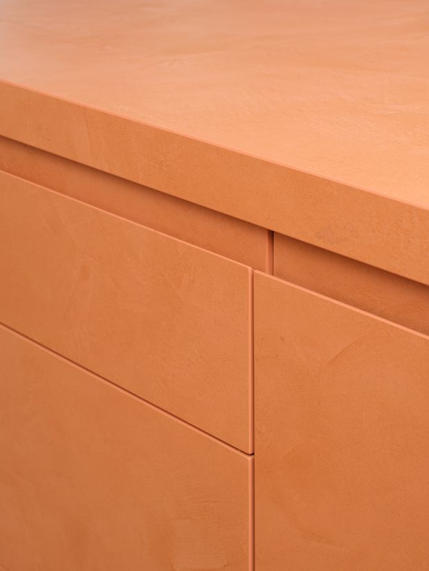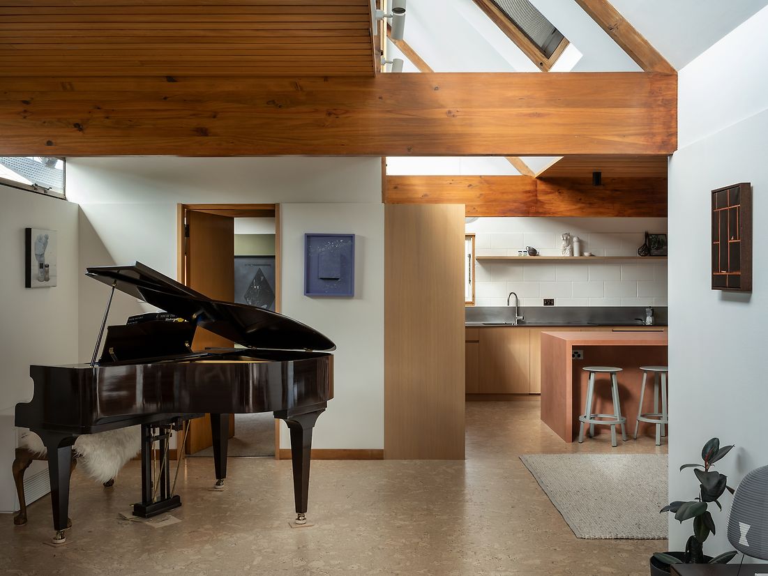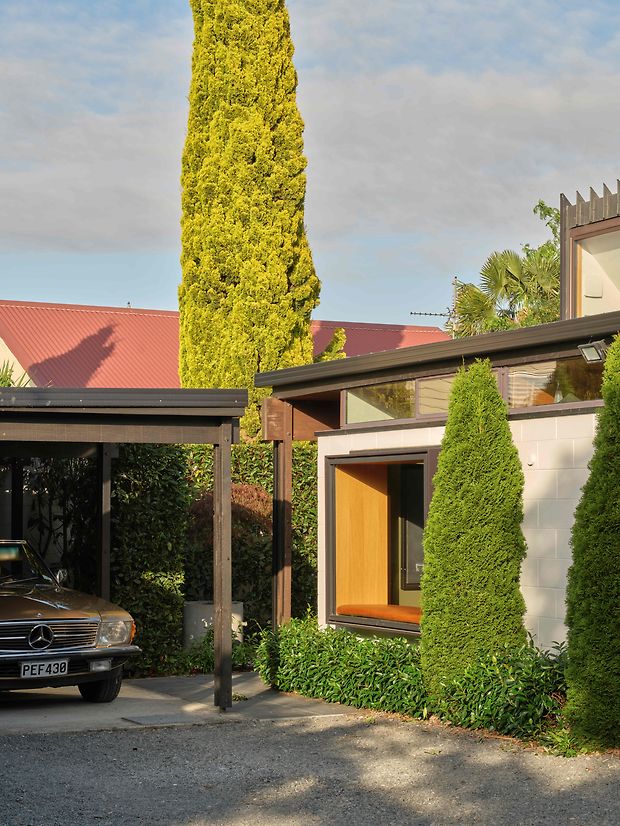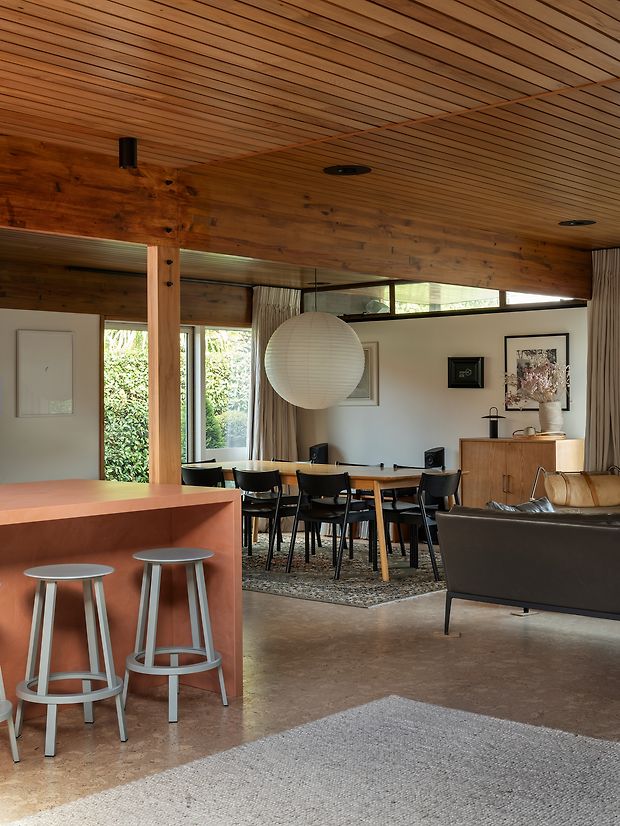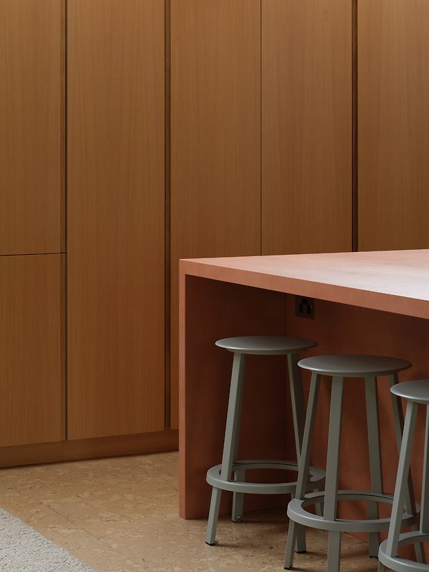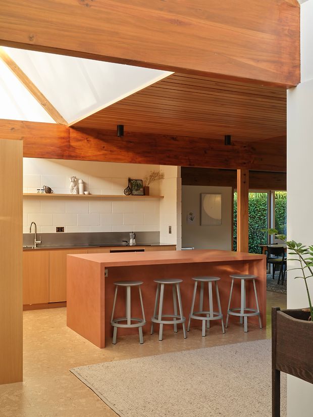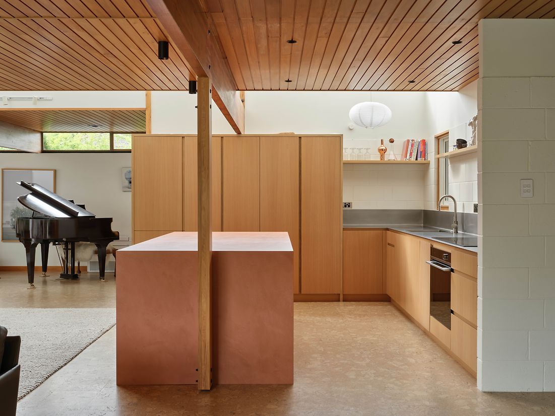 The renovation lets the home's original form take focus by leaning on a restrained palette of concrete block, pale oak joinery and negative details with simple stone and stainless steel worktops. The green-tiled bathroom and terracotta kitchen island stray from this neutrality to introduce a sense of playfulness, warmth and texture. Removing internal concrete walls opened views through the home and the outdoors, which lends itself to day-to-day whānau life and entertaining. It also affords the central space a fresh versatility with an interchangeable lounge, living and dining layout.