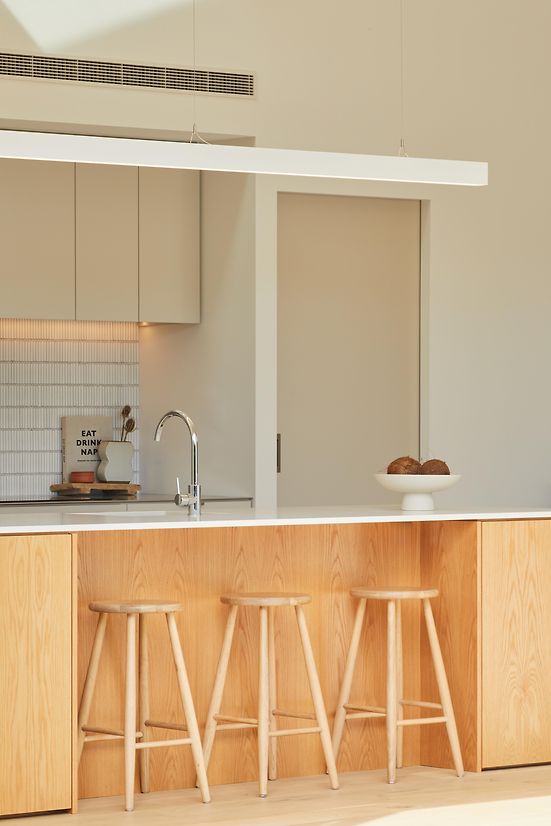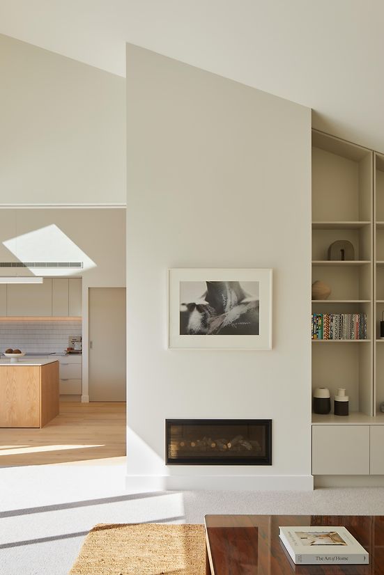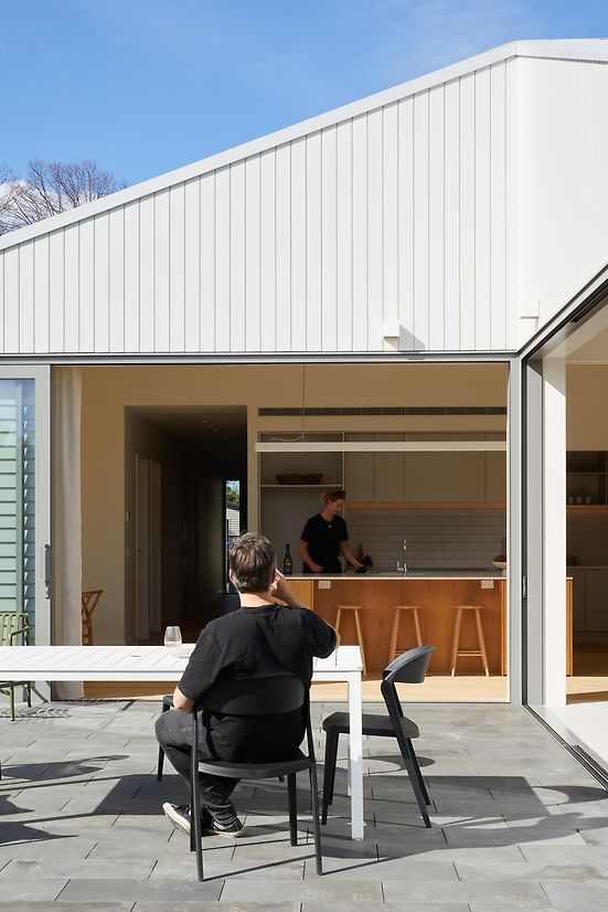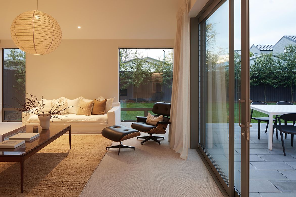 Inside, the home is softened by natural texture and warm tones, its high ceilings emphasised by oversized glazing. Commissioned by a first-time developer, Split Hip demanded design ambiguity, easy living and open spaces to appeal to the mass market — an effective strategy that saw it garner interest from young families, downsizers and retirees when it hit the market.