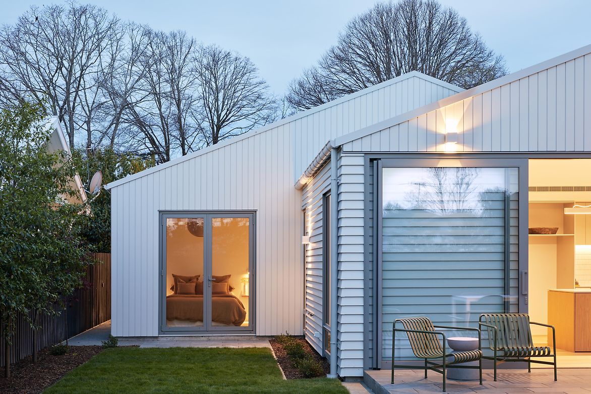 To establish its own identity, the design deviates from the bungalow aesthetic with a cantilevered metal shroud replacing the familiar street-facing bay window. The garage, commonly delegated to the backyard, is discreetly integrated up front to optimise outdoor space and internal access.