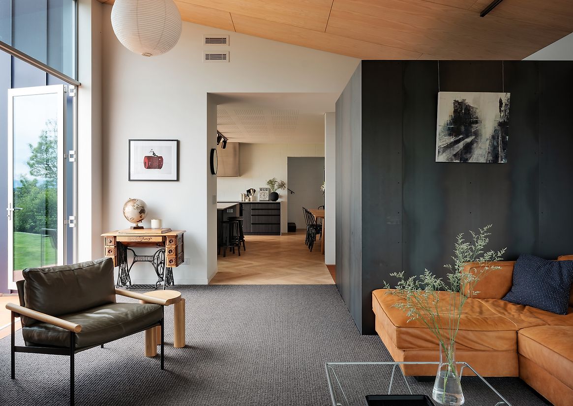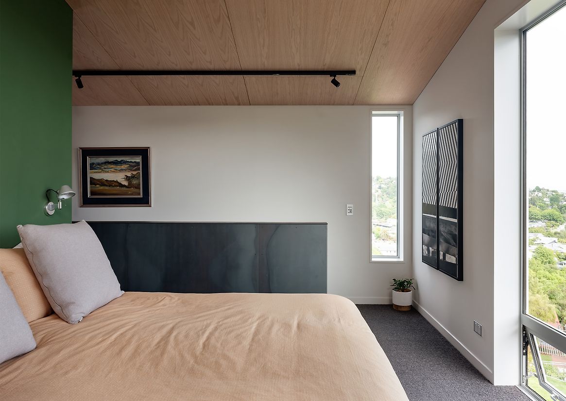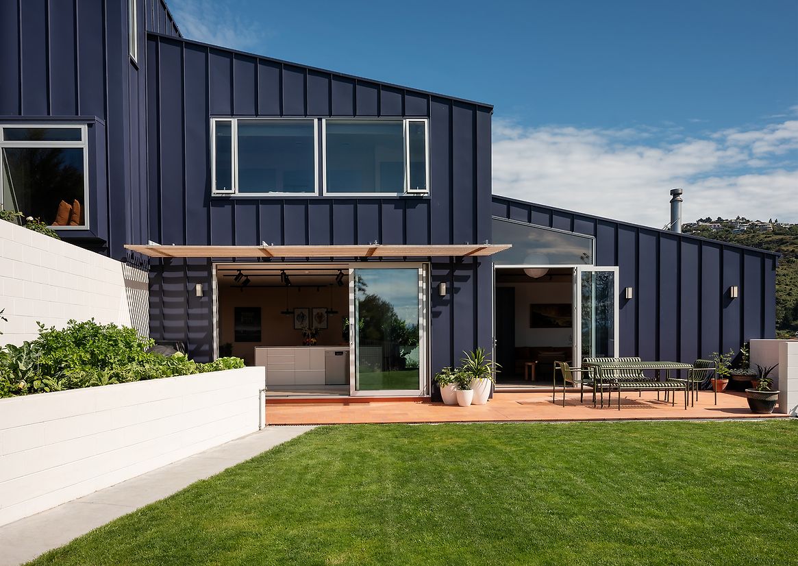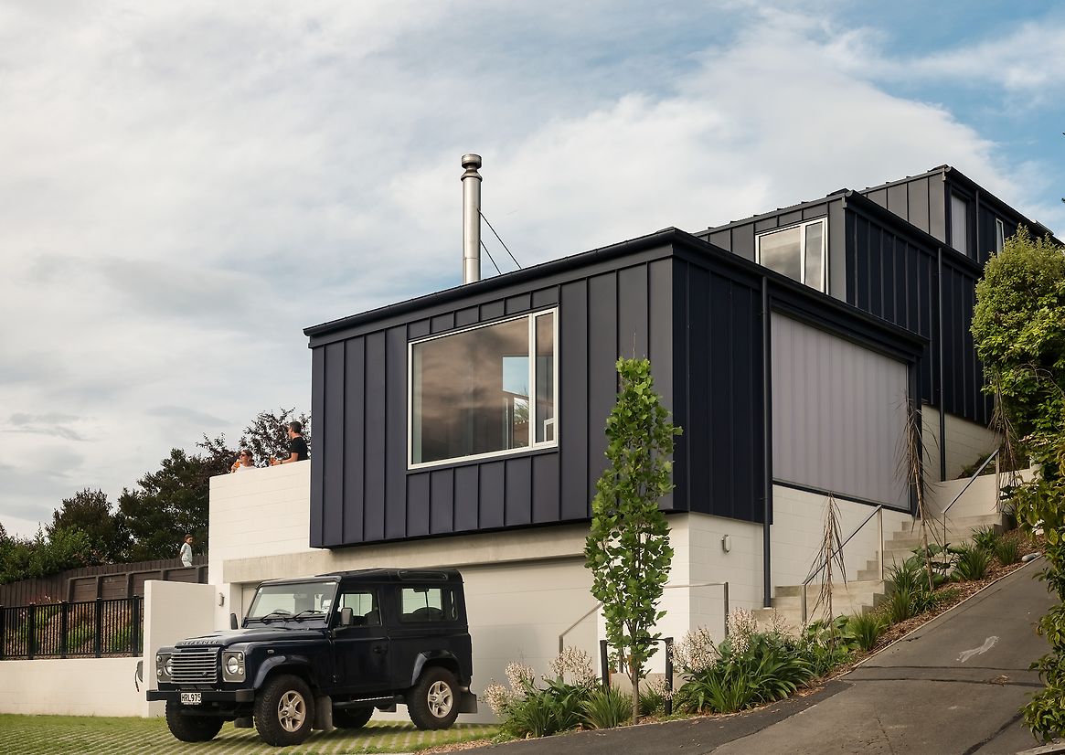 Consideration was given to construction materials; primarily timber framing, with additional detailing to minimise thermal breaks and timber overuse, blockwork used for integrated stepped retaining levels of the home, exposed honestly both externally and internally, wide tray coloursteel cladding and roofing used for the majority of the external envelope, locally site measured and fabricated to for carbon efficiencies and purposefully low-maintenance on a tricky hill site.