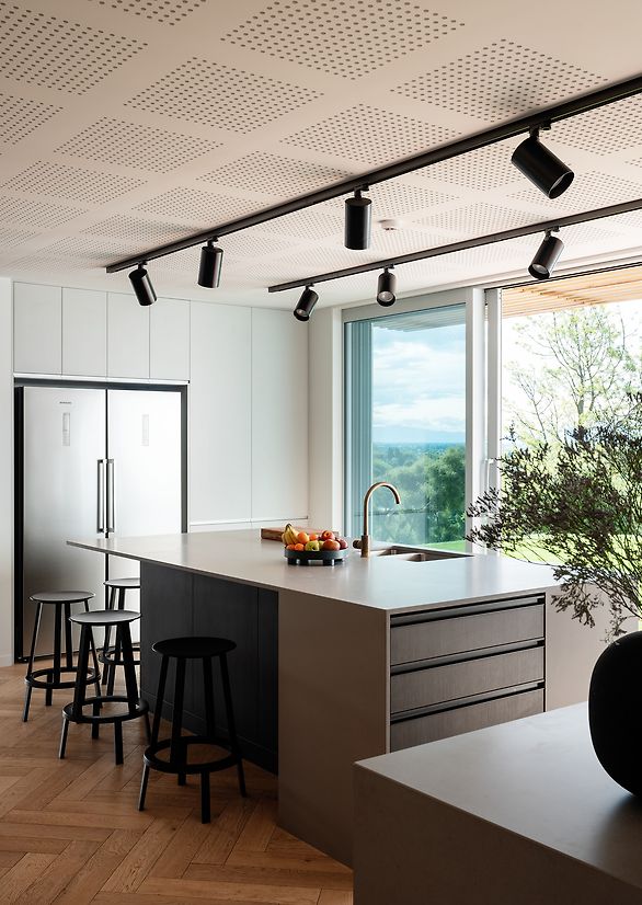 Triptych unfolds over 3 levels sitting above the garage plinth, each level offering a sense of reveal and function whilst feeling connected, intimate and spacious. The lower level of each of the 3 stepped forms follow the topography of the site with access to outdoor spaces. The home offers multiple areas for the family to occupy; a large family living room with reading nook, a window seat at the end of the first flight of stairs, a landing space alongside the children’s bedrooms with its use evolving over time to suit the children’s ages and changing needs. The main bedroom and study have an open connection to this area.