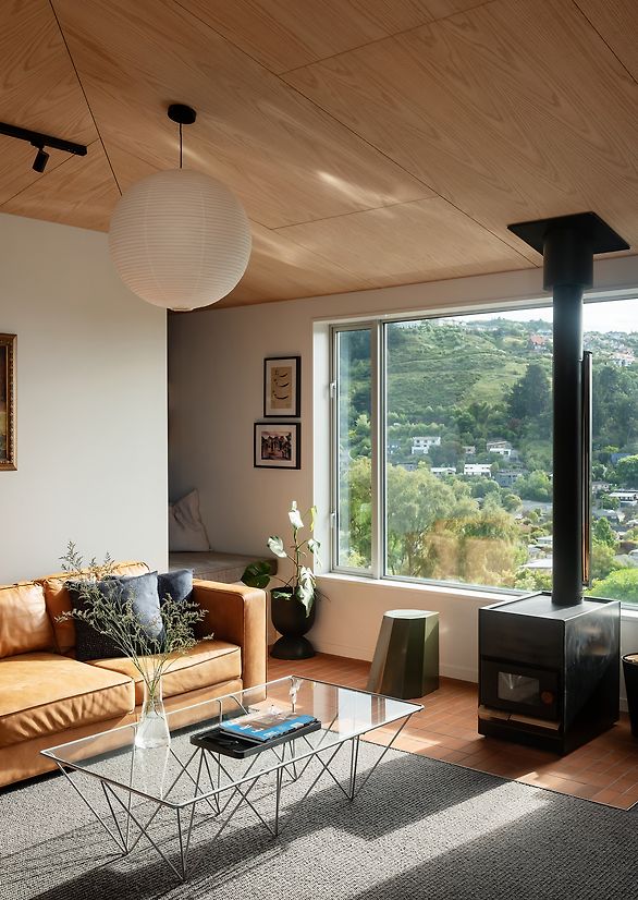 The sloping hill site is accessed from a steep private right of way shared with 5 other properties. The site, trapezoidal in shape, has a narrow boundary against a road to the east resulting in a larger boundary building setbacks. The design response was to break the home up into 3 forms, each stepping up and across on the site responding to the topography and other site constraints, informing the quarter-pyramid roof shape. This enables all forms of the home to fit within the permitted building envelope and to ensure sunlight and outlook to adjacent homes are retained.
