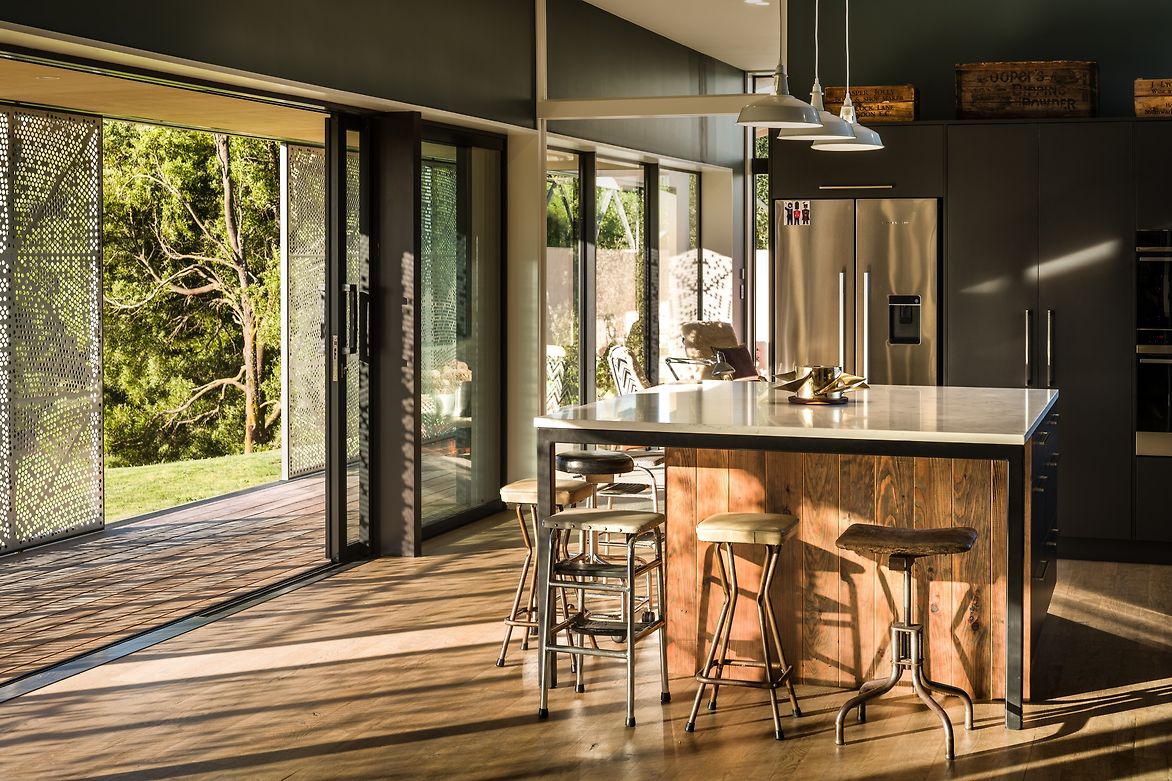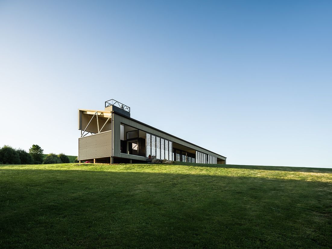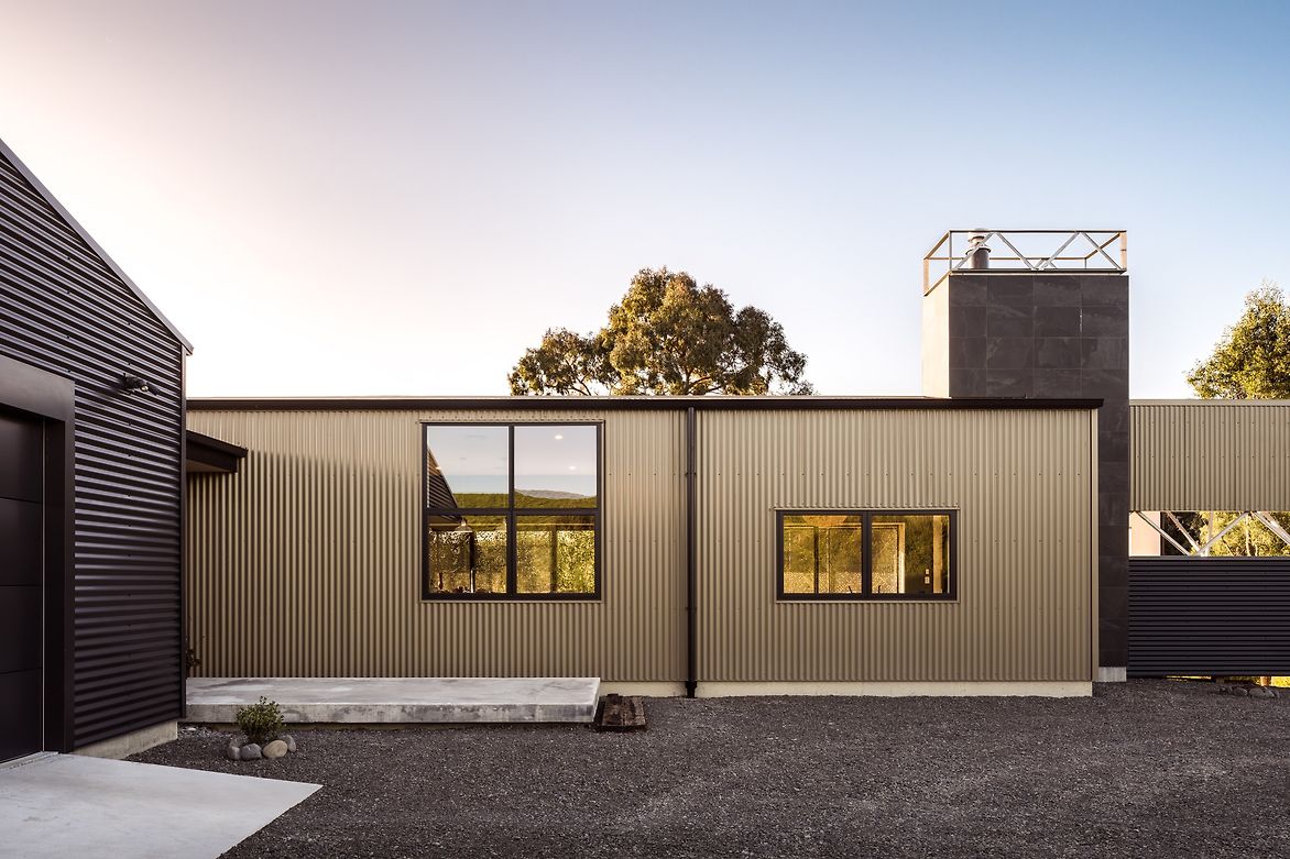 Corrugated Colorsteel, used in two directions and colours, expresses varying functions of the enclosure. Within the dwelling edge, timber is used to warm the spaces with a sense of home.
