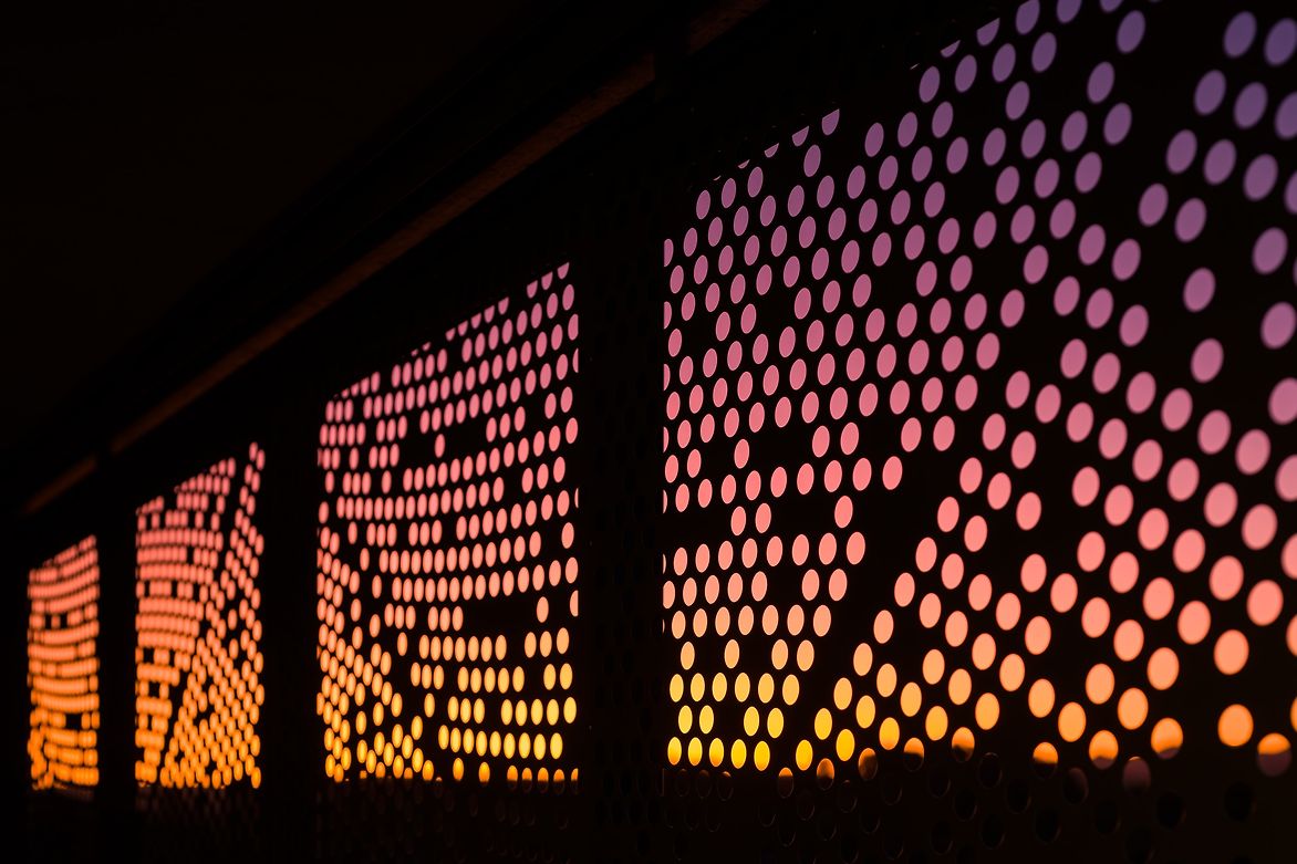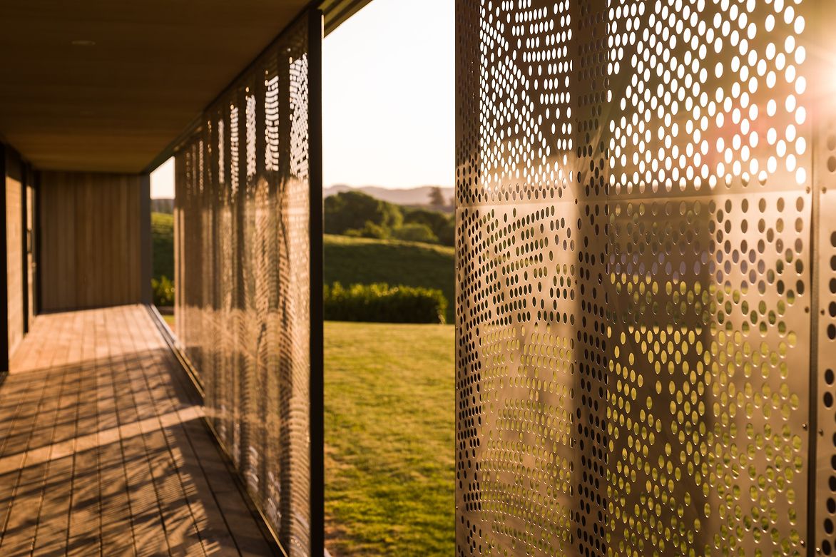 Our solution to intercept the low westerly sun is sliding screens. Formed with perforated stainless steel over a painted steel frame, each 4.5m screen can be positioned at any point along the westerly elevation. Heat can be dropped while still appreciating the view and enhancing the space with a relaxing dappled light.