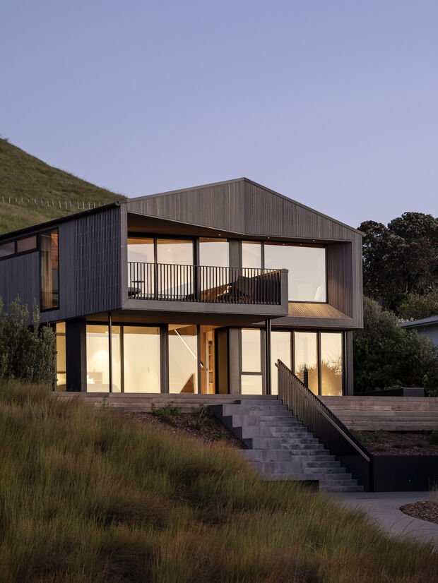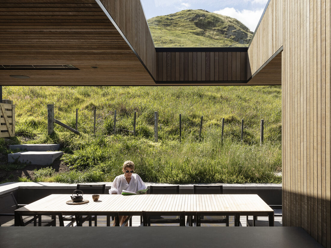 Hill to Horizon house explores retreat and openness, gracefully unfolding between retired paddock and coastline. Beneath a pleated and folded form, it is a house that strives to balance tensions: intense light and dark, intimacy and expanse; versatility and connection.