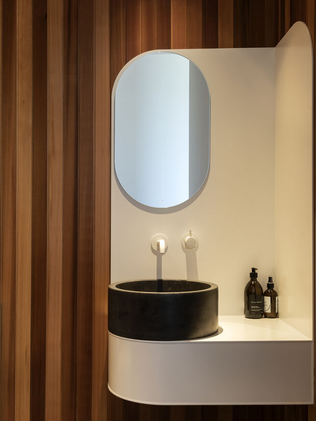 It’s grounded with plaster and dressed in a subtle timber tone.