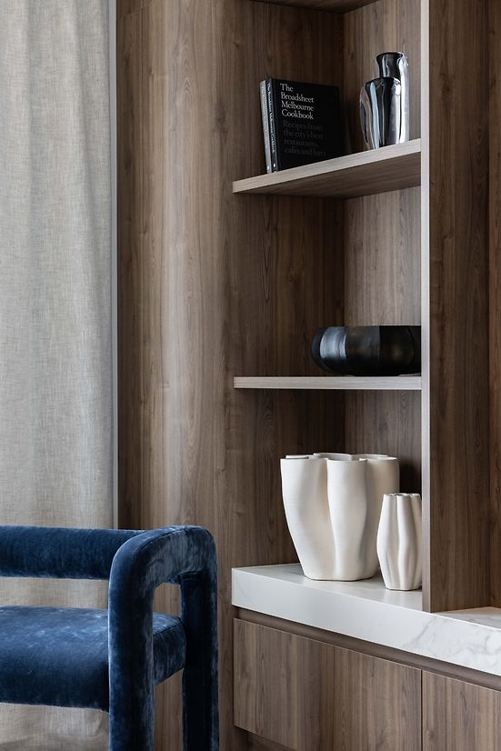 When our clients decided to downsize, they knew exactly what they wanted: a central city location, a smaller footprint, and no compromise on quality. They found a modest apartment overlooking the Avon River, well located, but underwhelming. The brief was to reimagine the space completely, creating a refined, high-spec home that felt spacious and luxurious. We worked with Metzgar builders and completely gutted the interior, giving us a blank canvas to recreate all 3 floors. With the existing structure and plumbing fixed, we focused on careful spatial planning, built-in elements, and cohesive materiality. A continuous joinery wall anchors the mid-level, concealing existing steel posts and smoothly transitioning between living zones. Custom furniture, soft curves, and rich, layered textures brought flow, softness and warmth to the space.