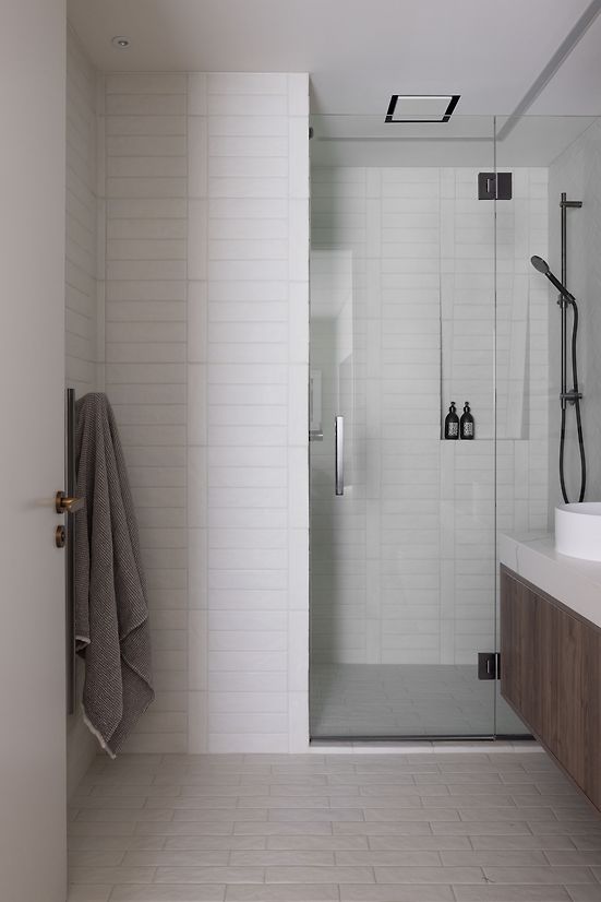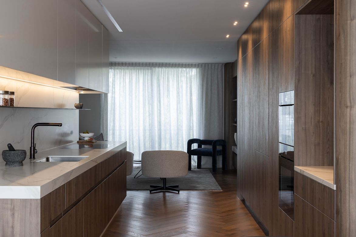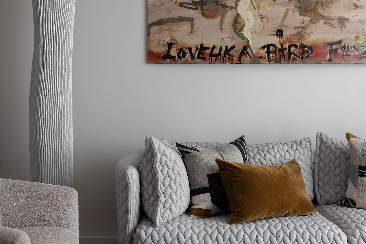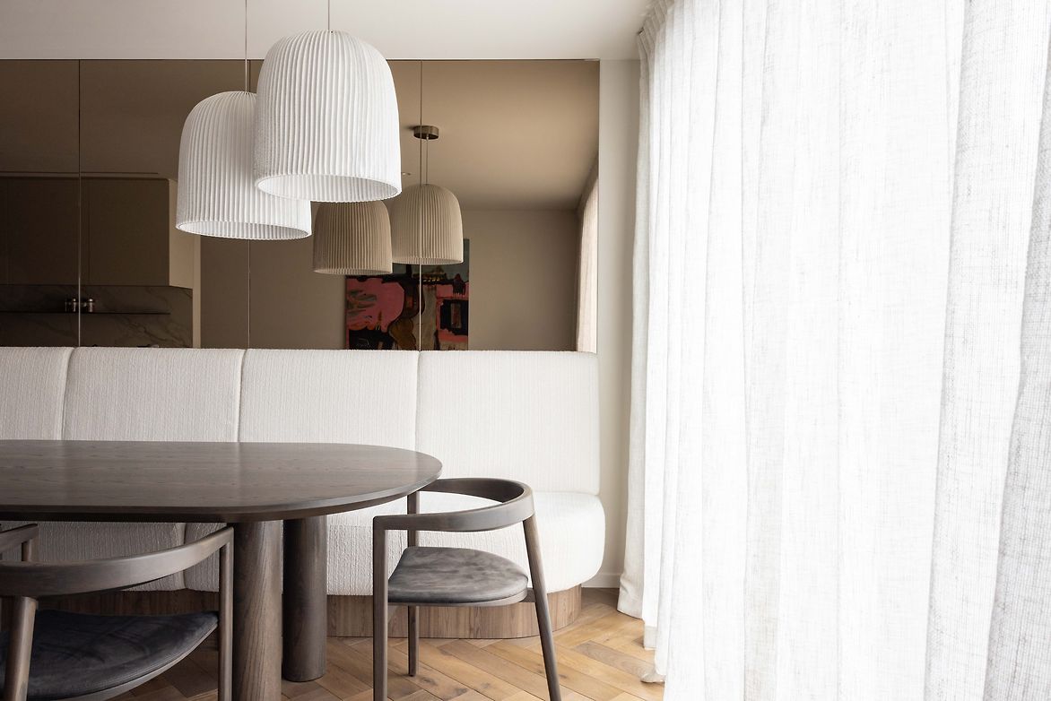 The result is an apartment that feels generous, thoughtful, and calm. Colour, materiality, and architectural lighting were used to define each space, with a palette of soft browns, greys, and whites, accented by subtle pops of colour through furniture and layering. Every detail was deliberate, from the custom stone toe kick and built-in banquette seating to the angled shower niches and carefully selected lighting and furnishings — all working together to create a cohesive, refined interior.