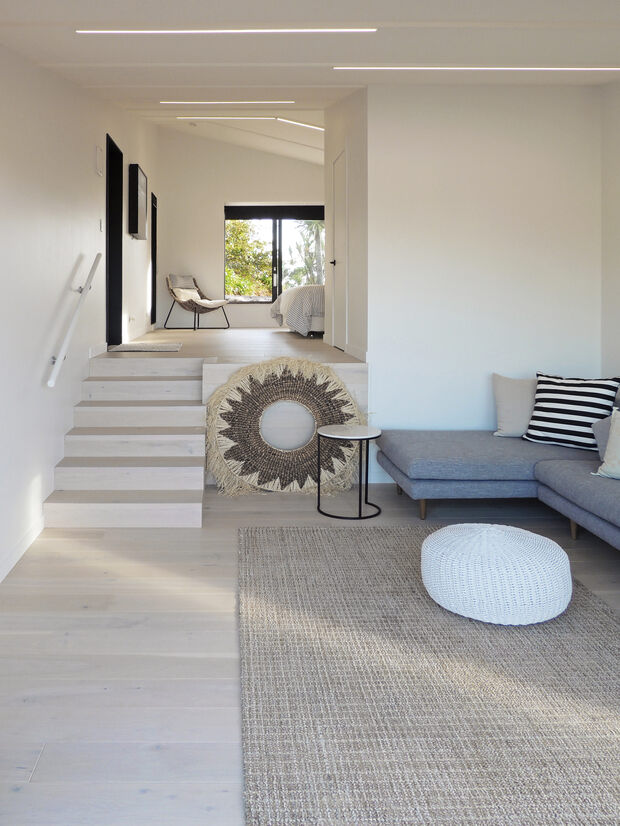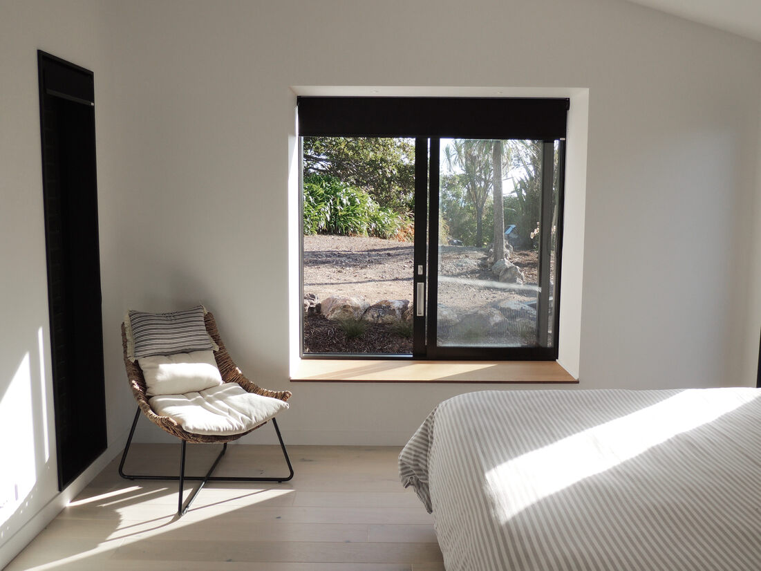 In contrast to the exterior and semi-exterior of the building, the interior is pared back to a white-on-white aesthetic, and incorporating references to the historic bach such as battened ceilings, whitewashed floors, and simple décor.
