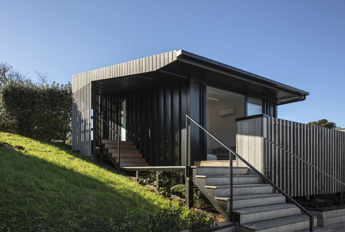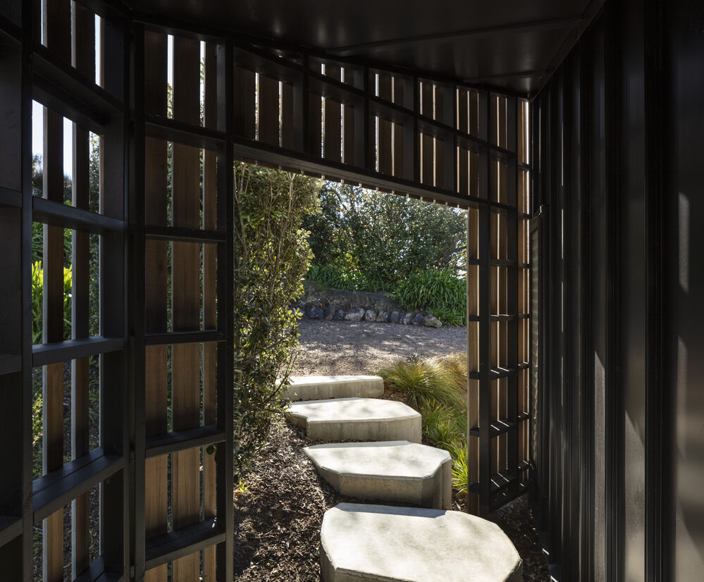 The form and positioning of the new stand alone building follows the site’s natural topography; is split over levels both internally and externally; and orientates to align and frame views both through and from within to the north and south coasts of the island. The approach from the road sees the new sleepout stand as sentry over the site, and creates a demarcated transition from public to private realm through the gateway.