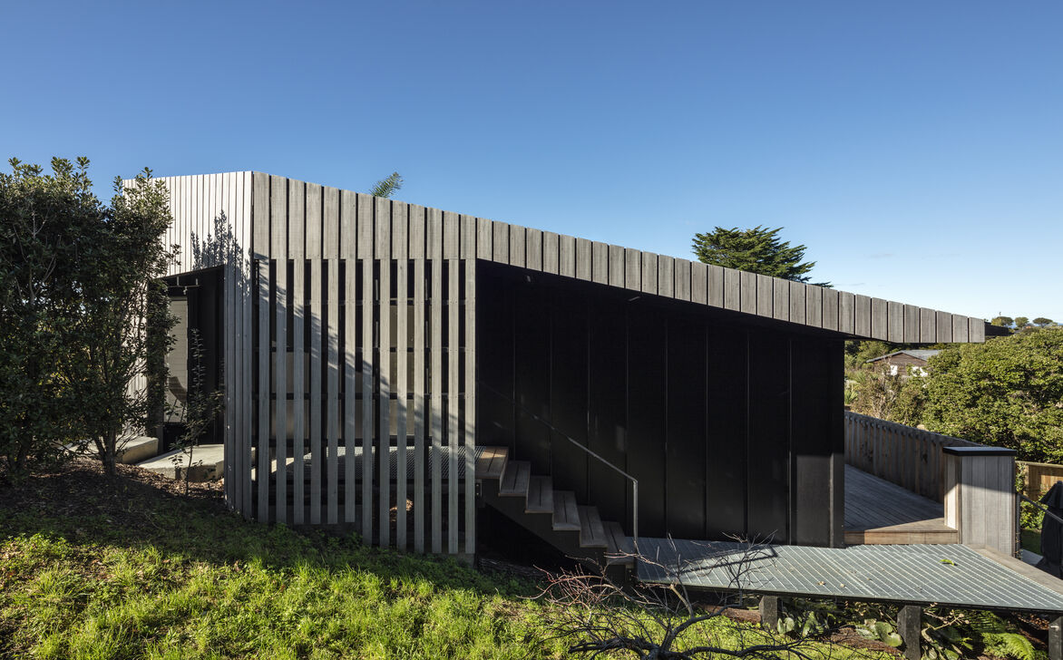 We picked up on elements of the existing bach, as well as an old tin woodshed on the property in the conceptualisation of an aesthetic palette of materials - weathered timber, corrugated iron, battened claddings and linings - and reinterpreted these into the new structure. The new building is dressed in weathered thermally modified bandsawn timber on the outer shell, and black profiled vertical steel cladding with the interstitial gateway space. The weathered skin is punctuated in part as a screen with varying degrees of openness, blurring the boundary between inside and outside.