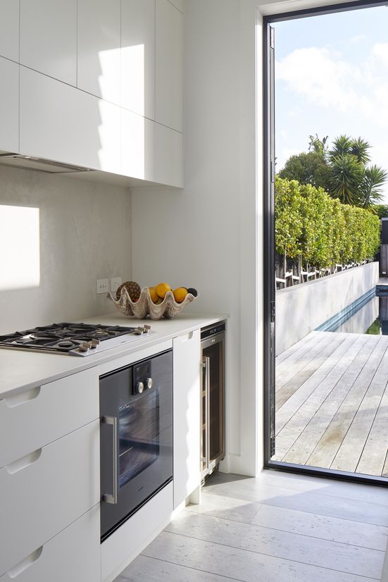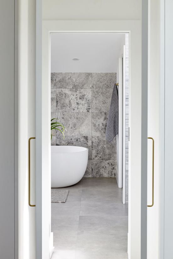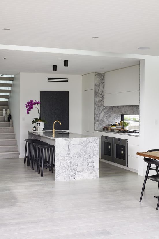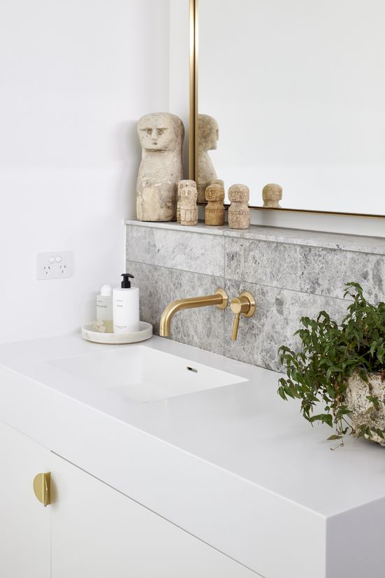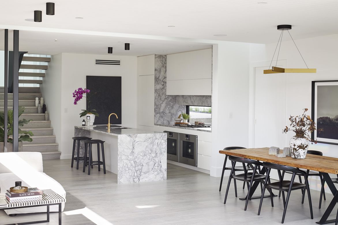 The overall aesthetic is luxe and simple. With one of our clients owning a local cult fashion retail store, we wanted to emanate this style in the home, while also keeping it relaxed and for family. Smoke-washed timber on the floors, super white granite wraps the kitchen island and backbench, and brass adds a layer of jewelry detailing.