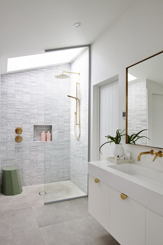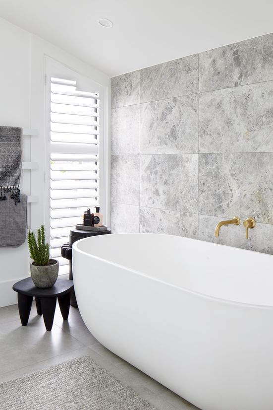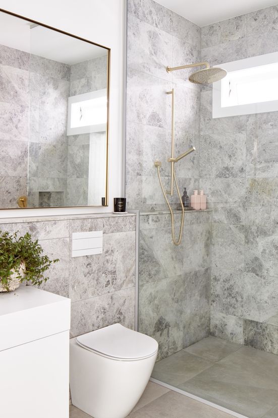 Detailing in the bathrooms mimics the kitchen, with brass and marble being key features again.