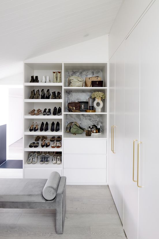 The walk-through dressing room is designed to replicate a luxurious retail store, with all the beautiful things on display, and the clutter hidden away. The Ensuite is hidden behind doors in the wardrobe, like a door to their own Narnia!
