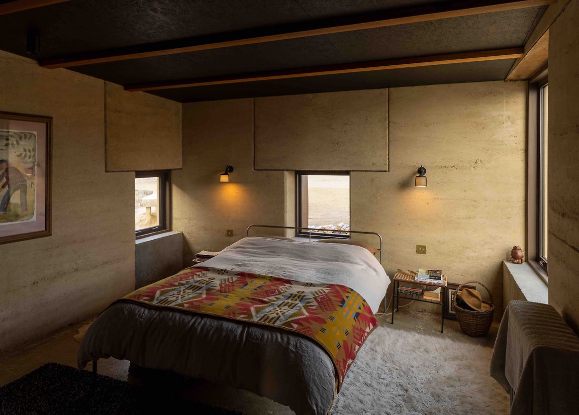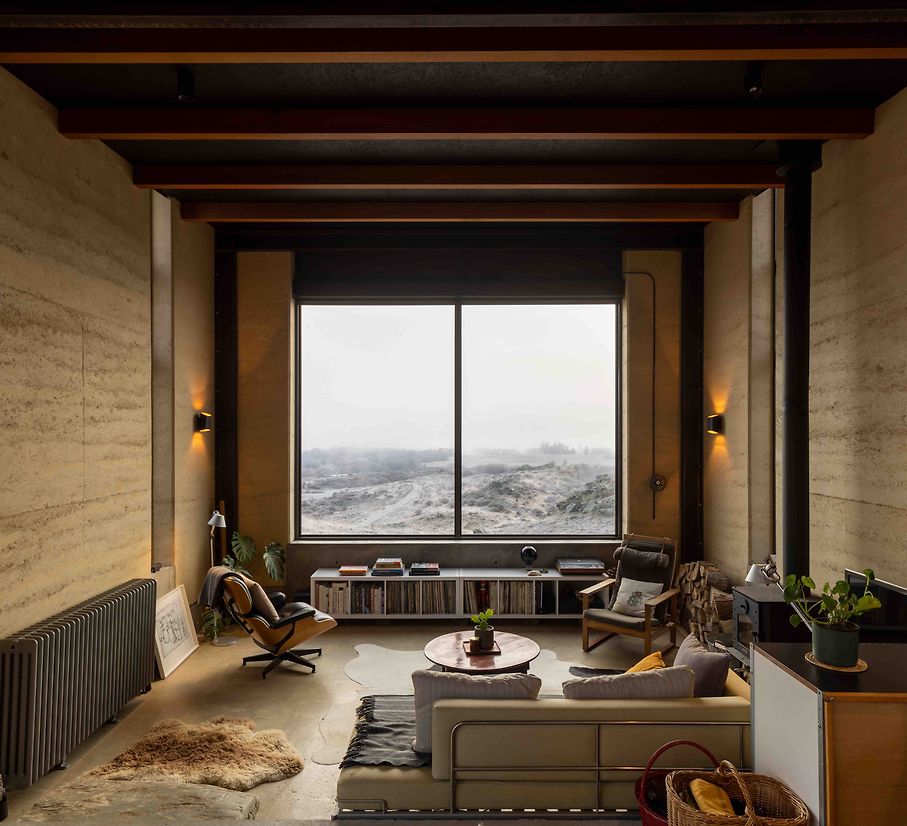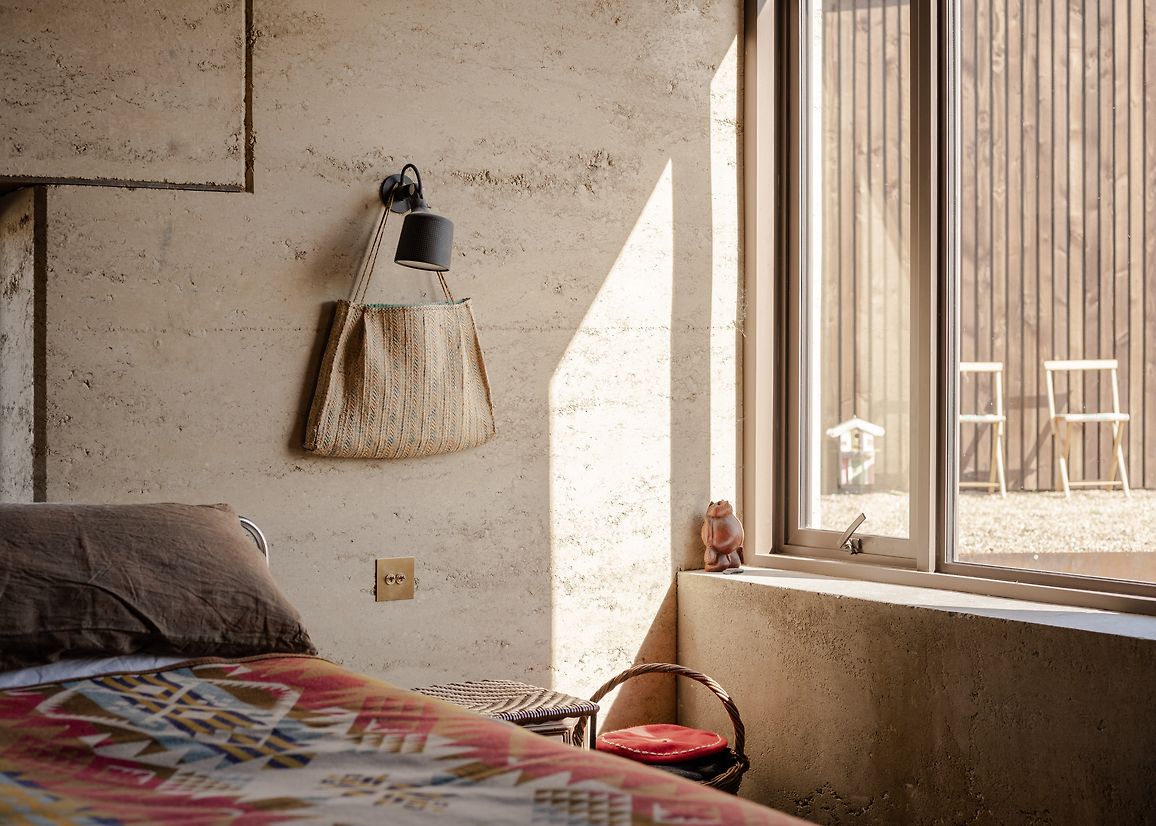 The Rammed Earth construction method was chosen for its ease of supply being “sands of the land”; and its long lasting and requires no maintenance. As the ‘Earth' is a mix of clay & sand sourced locally it blends with the natural setting both in colour and texture. Earth has a beautiful aesthetic quality detailed here to be expressed both as the exterior and interior finish. Thermally it offers 'coolth' in summer and stays warm with a little constant heat in winter.