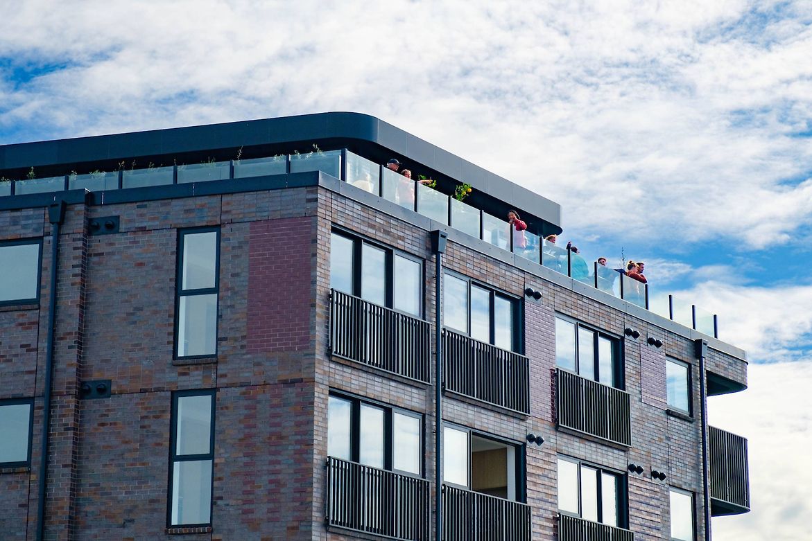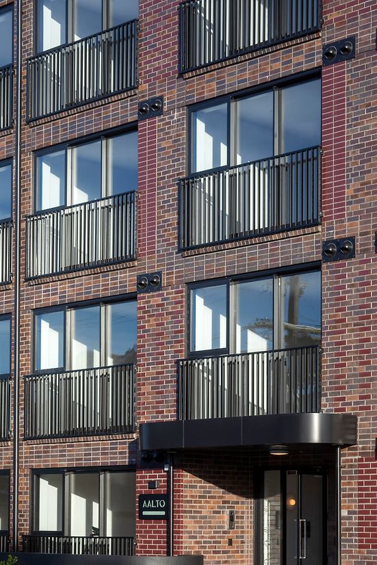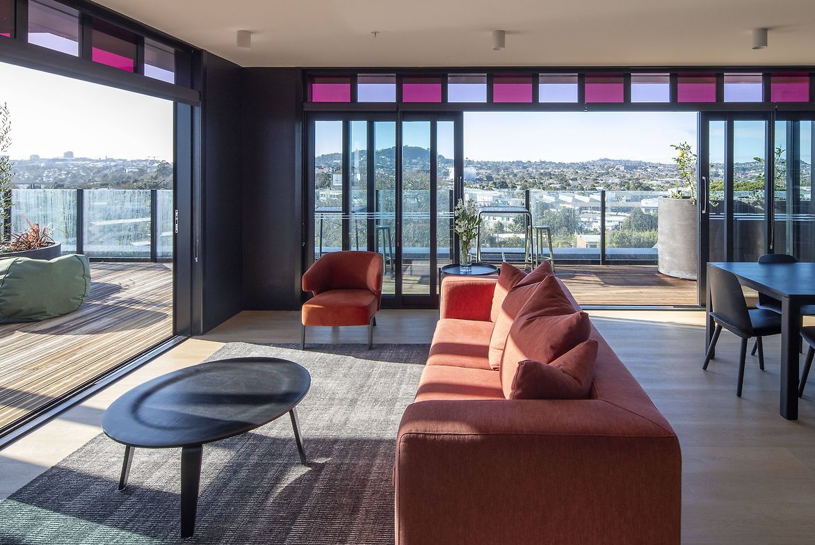 Aalto sits proudly on a ridge providing expansive views of the city from the apartments and community spaces alike. Crafted from a rich and earthy clay brick, with maroon glazed brick highlights the building facade shifts and morphs through-out the day, changing from a deep dark purple in the shade to golden bronze hues in the sun. The building is topped with a glistening black brick communal penthouse, home to a sun soaked residents' lounge and kitchen, a wrap-around deck with expansive views, a work-from-home office, and a bookable guest room for visiting friends and whanau to stay.
