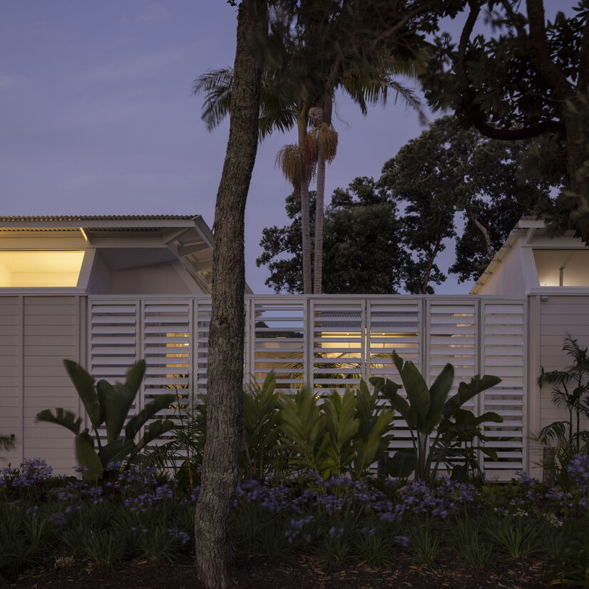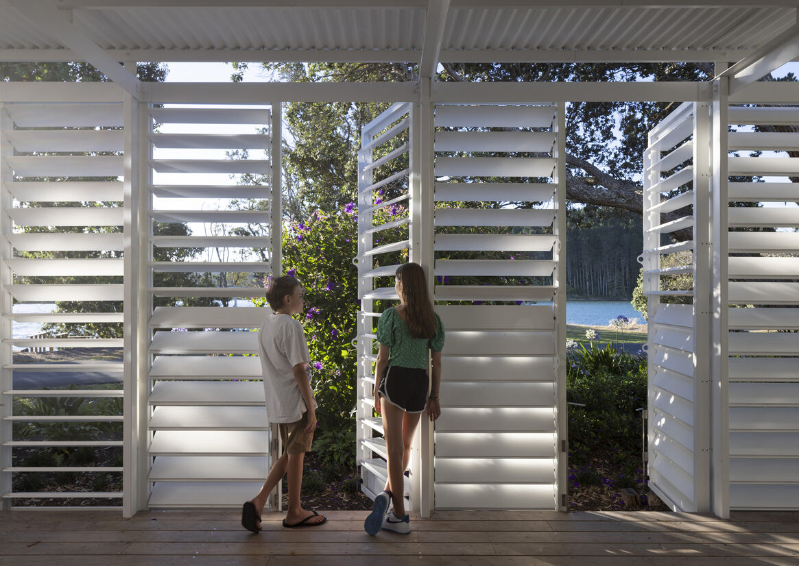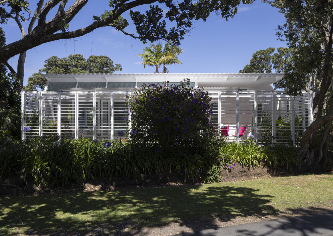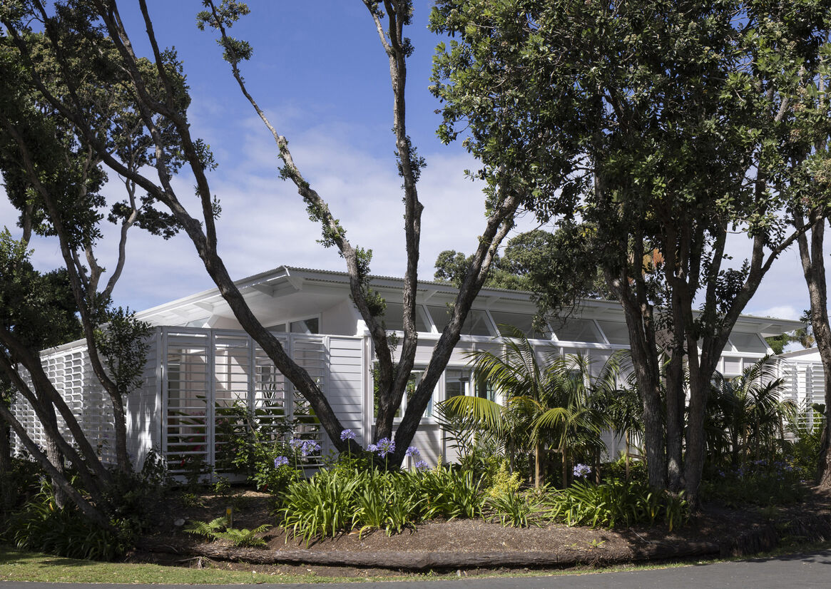 The house is bounded by a row of significant pōhutukawa and palms, and looks out to the tidal estuary of the seaside town. In front of the house is a spot with a jetty; it’s a congregation point for swimmers and locals going for a stroll.