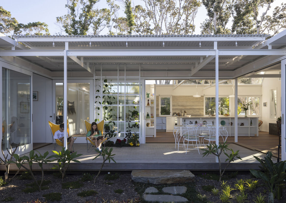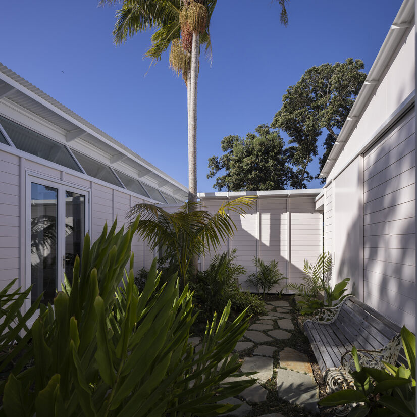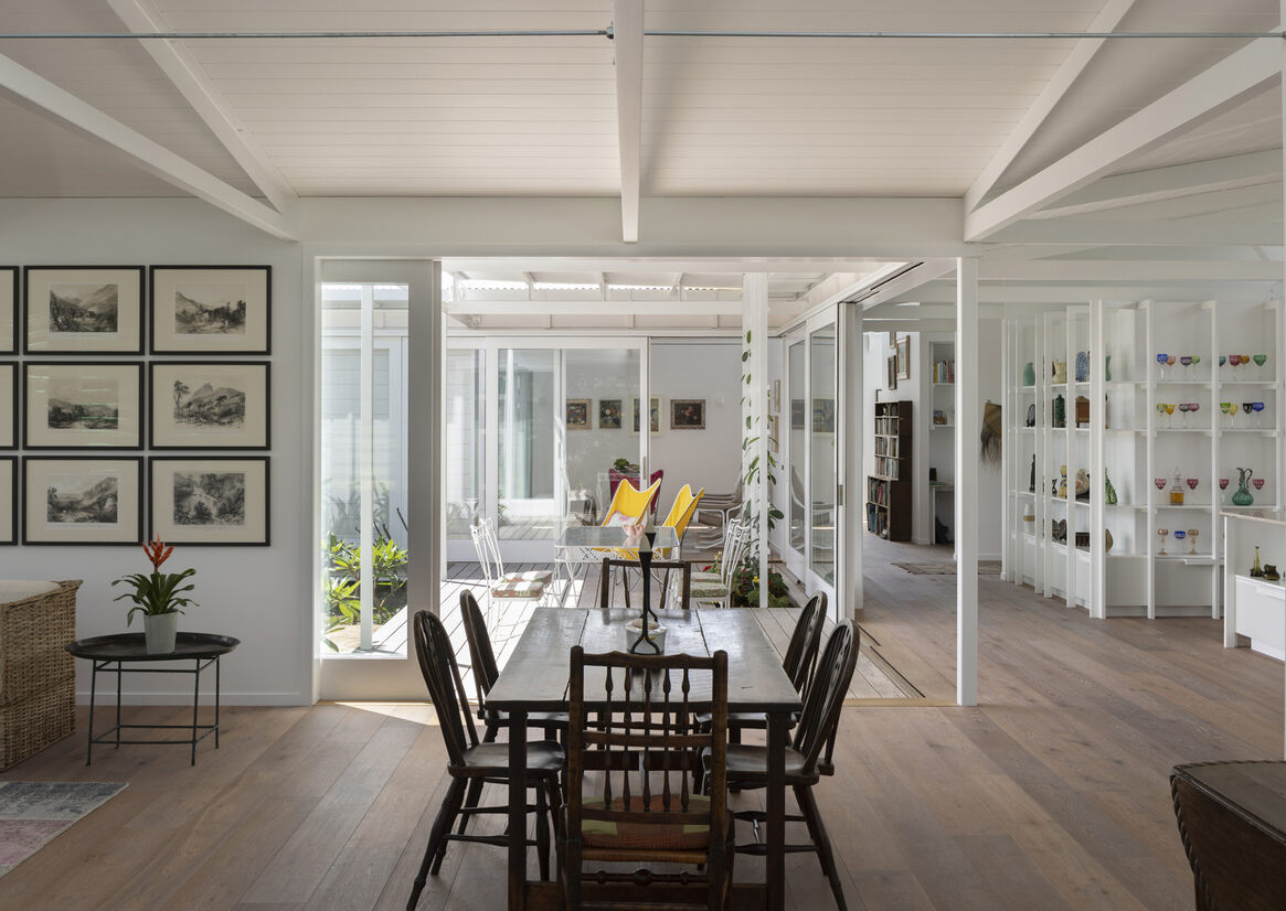 The house embraces its seaside setting with multiple points where the house can open to the promenade. Built to an 'S' plan, the predominant living spaces wrap around a central courtyard, with verandas and breezeways with louvred edges contributing both a garden lightness and the experience of being inside and out, simultaneously.