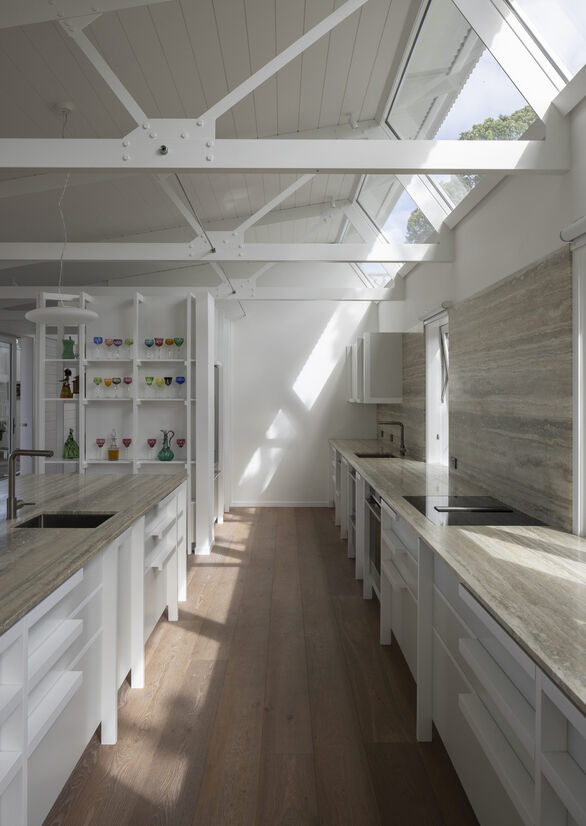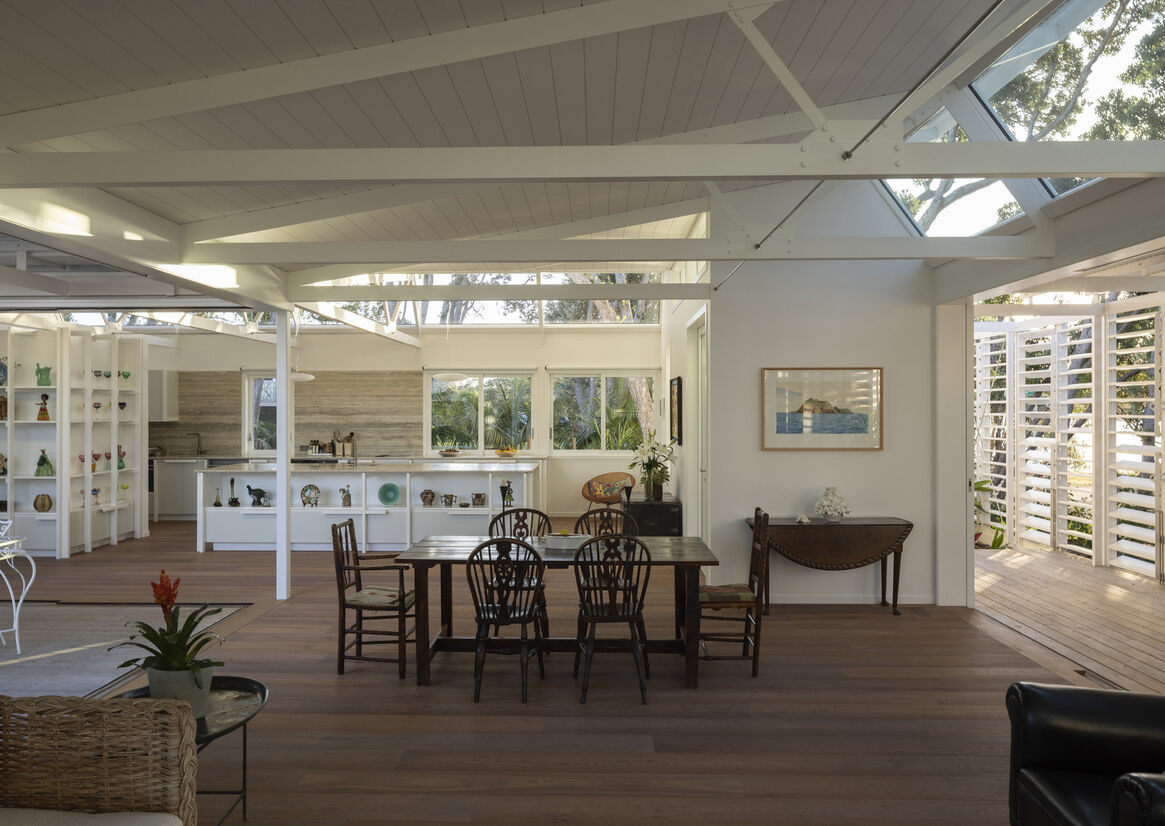 The raked clerestory windows supply a constantly changing atmosphere of light, shadow, and view of the pōhutukawa that surround the corner site. These windows also confer a temporal element – our clients can follow the movement of the sun (and moon, if so desired) throughout the home’s spaces, and enjoy the way light and shadow plays across the interior's carefully crafted structural elements.