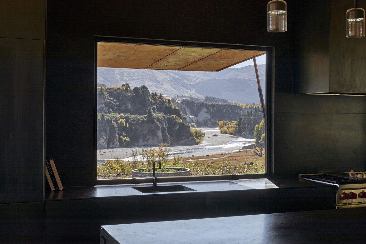 The kitchen is dark, with mild steel cabinetry and dark Belgian bluestone benchtops, setting off the view to the river through a shuttered window. The master bedroom is simplified and pared back with a wall of Oregon timber cabinetry concealing wardrobes, a desk and generous storage.