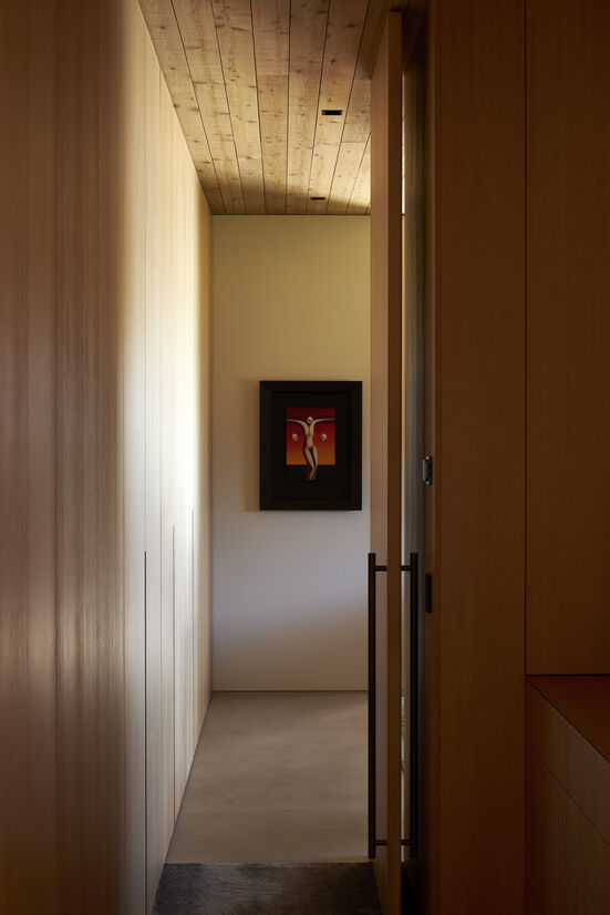 Each pavilion has a distinct, self-sufficient programme. The central pavilion includes a bright open living space flanked by a generous kitchen, the clients’ bedroom suite and their cosy snug. A separate guest pavilion houses a study and two suites for the family to come and go. The third pavilion creates a drive-through carport, with a small wine production area and wine cellar on one side, and with a wood store and plant room on the other. The fourth: a three-bay garage and workshop.