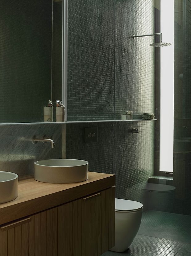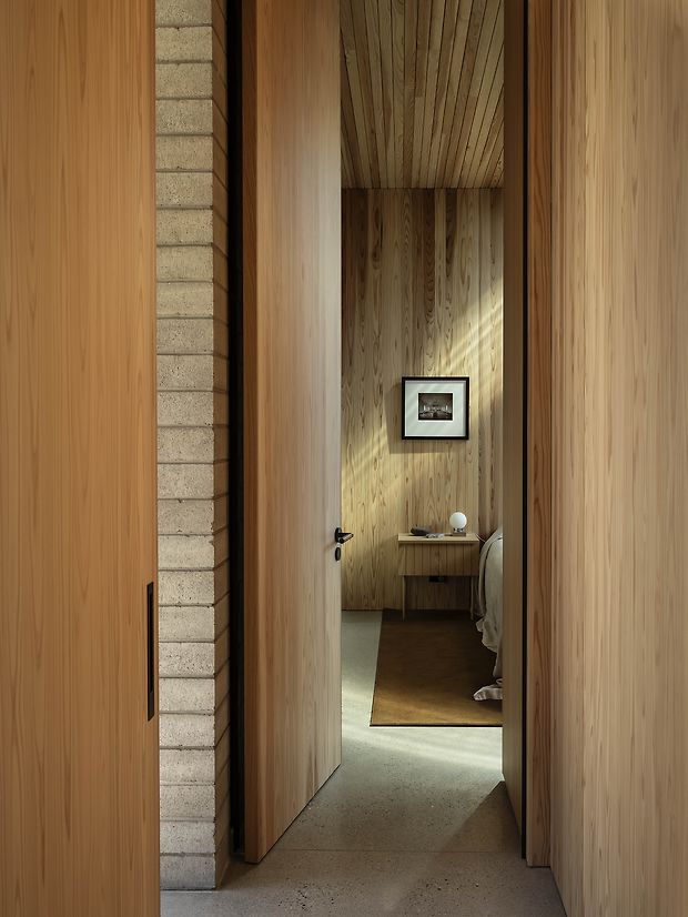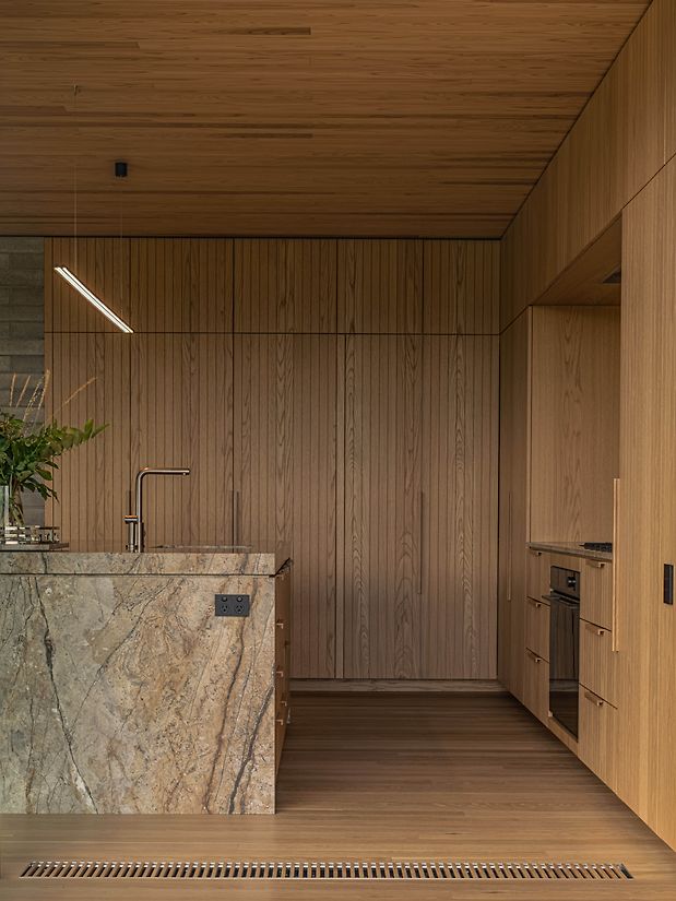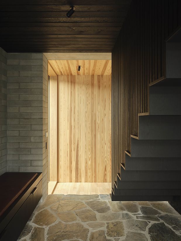 A reduced palette of natural materials creates continuity between inside and out. The module of these materials informs everything - from the characterful detailing to the proportion and openings of each room. This exacting relationship from part to whole is evidence of a strong collaborative relationship across the project team. The landscape response is much looser, offsetting the exacting geometries of the architecture with fractured edges to the stone paving and planting that varies in height and density throughout the seasons.