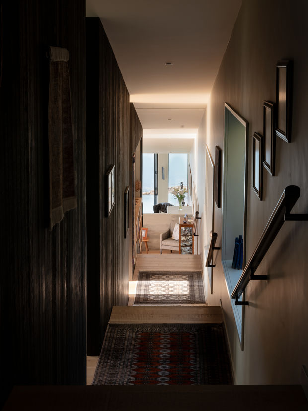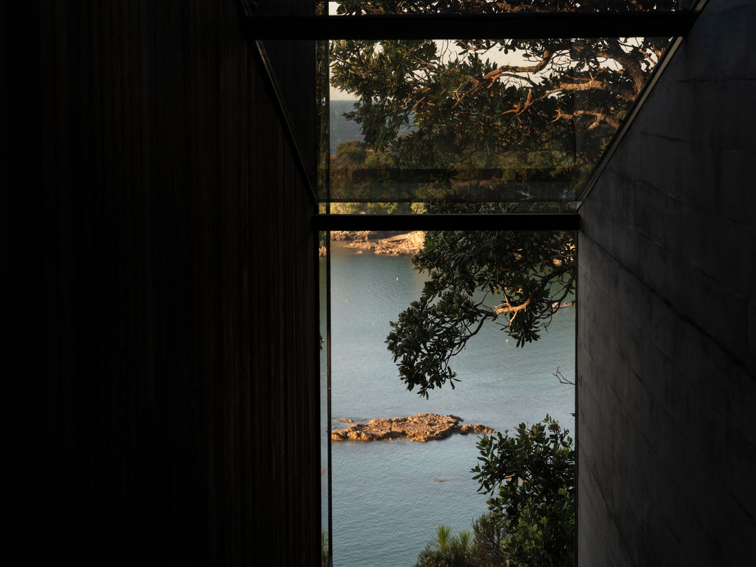 The long form of the house flows down the hill with the roof slope echoing the contour of the land. Multiple levels, a single room wide, are connected by a wide stair which culminates in a living room with expansive landscape and sea views. This room hovers over the main bedroom below and opens to a sheltered and shuttered verandah.