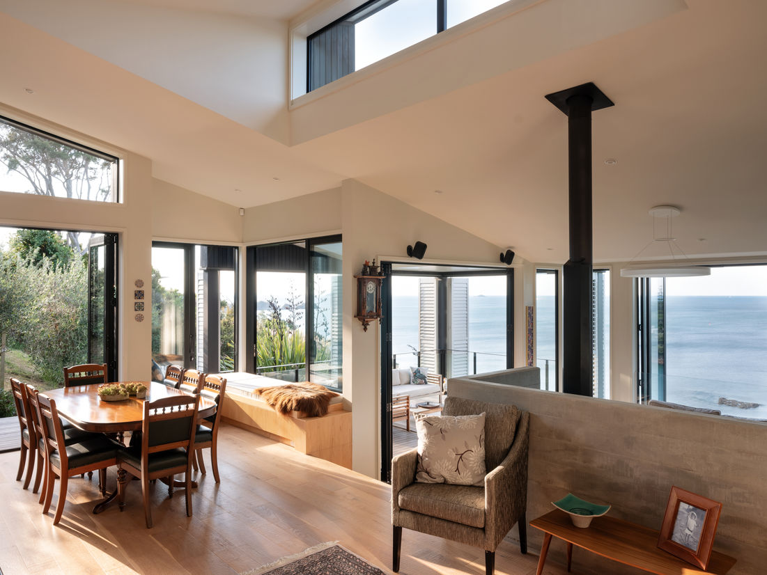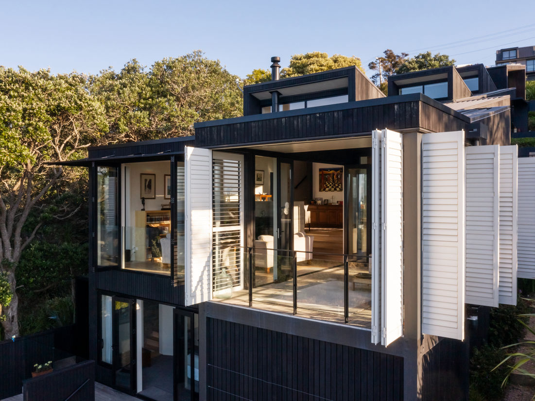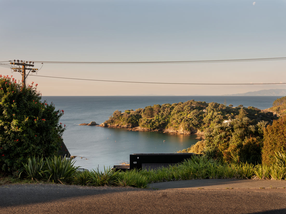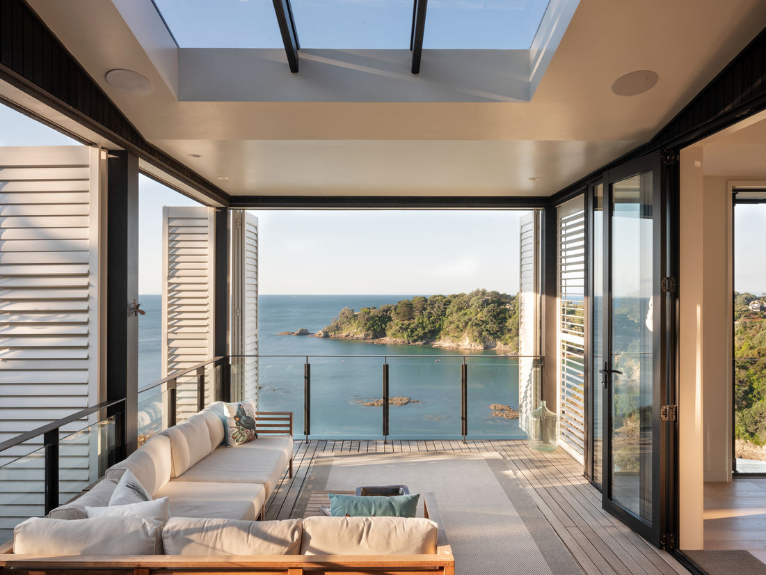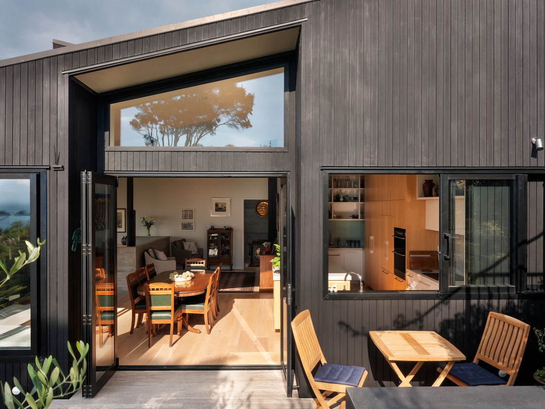 The Skinny House is located on a narrow steep site in Waiheke that slopes 150 metres from the road above to the rocks on the coastline below.