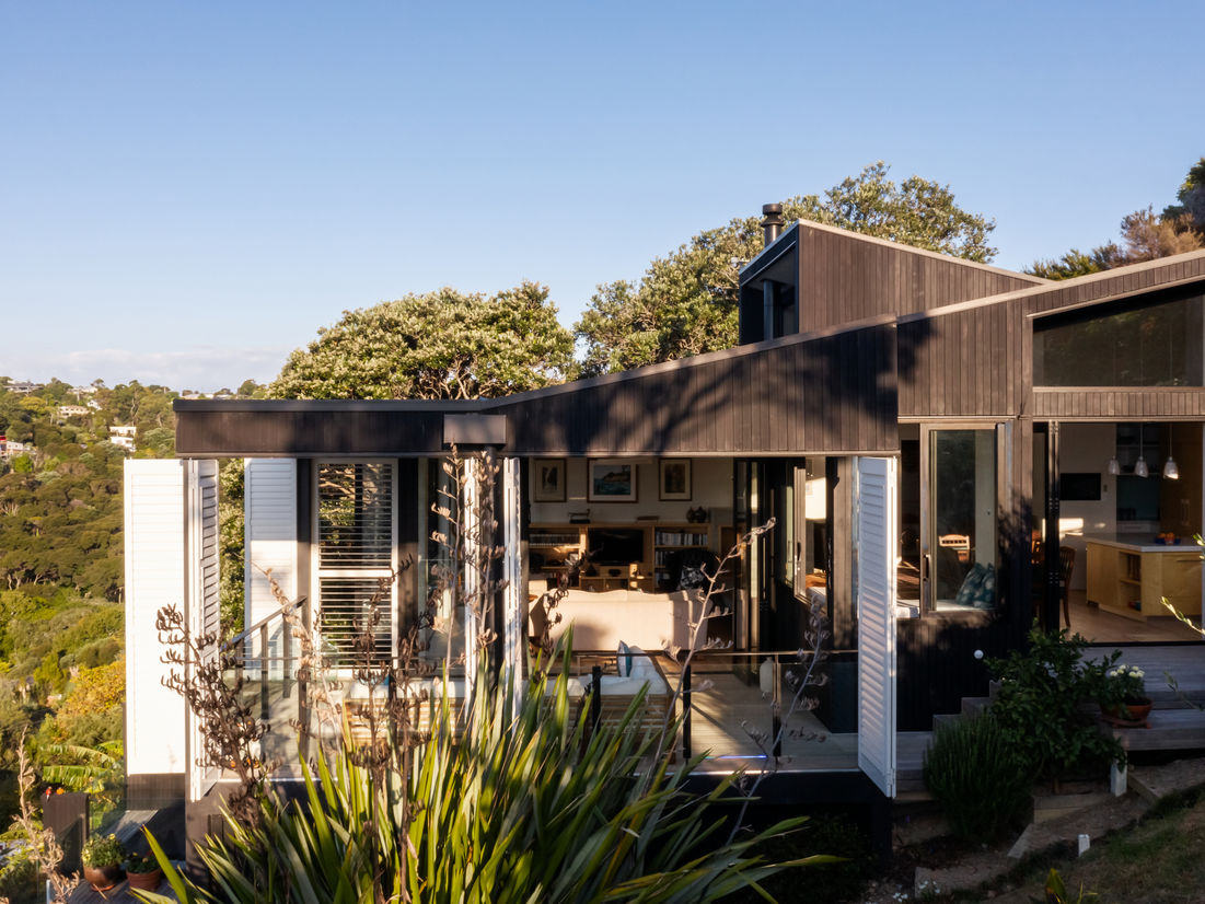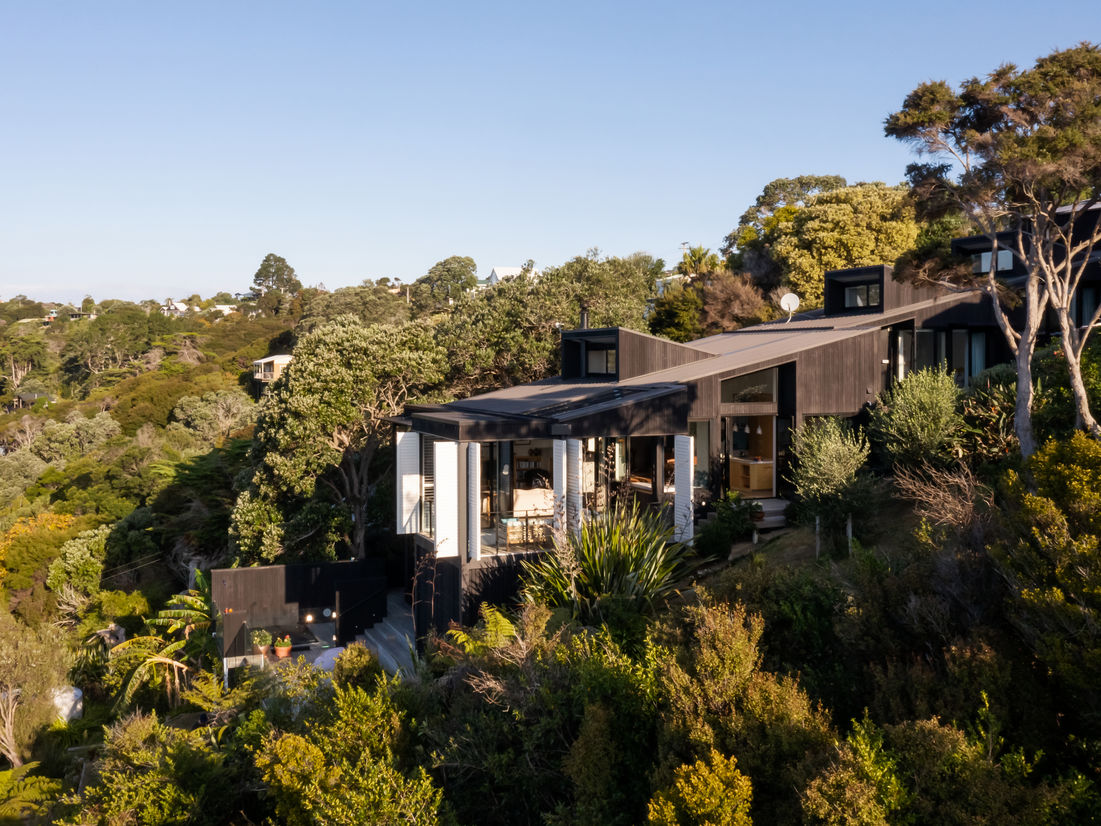 Out clients, who live full time on the island, were determined to downplay the impact of their new house on neighbours and on the natural environment. Consequently, the house was sited well down the section and has a low profile, with each level semi-buried into the natural contour of the land as you move through the building. Dark recessive colours have been used and extensive planting mitigates the intrusion into the landscape. Each bedroom extends into its own small courtyard, and light and sun penetrate the long, thin plan through areas of clerestory glazing.