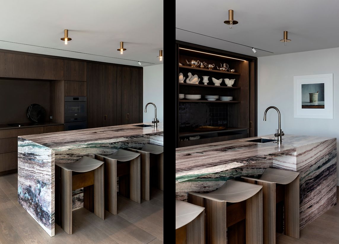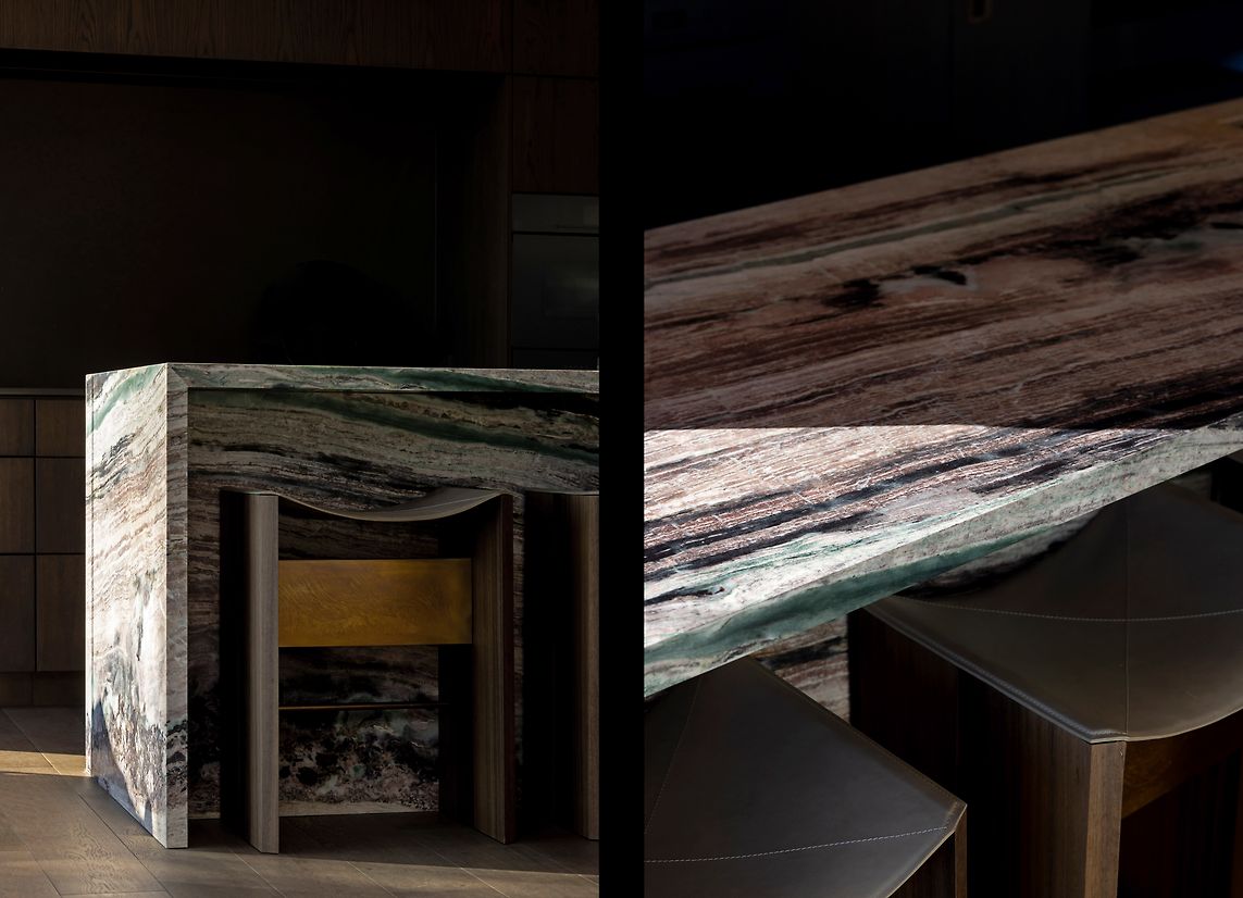 Inspiration evolved through natural materials and hues of mauve, pink and brown together with hints of green, an ode to an ‘80s colour scheme. The pivotal foundation for the design formed upon sourcing a rare piece of Kingswing Chinese Jade stone with a painterly quality. This layered palette combined with the neutral aesthetic of the existing architecture and fixtures form a transitional experience between the old and new. A distinction which provided the unique opportunity to conceptualise the interior design as a work of art.