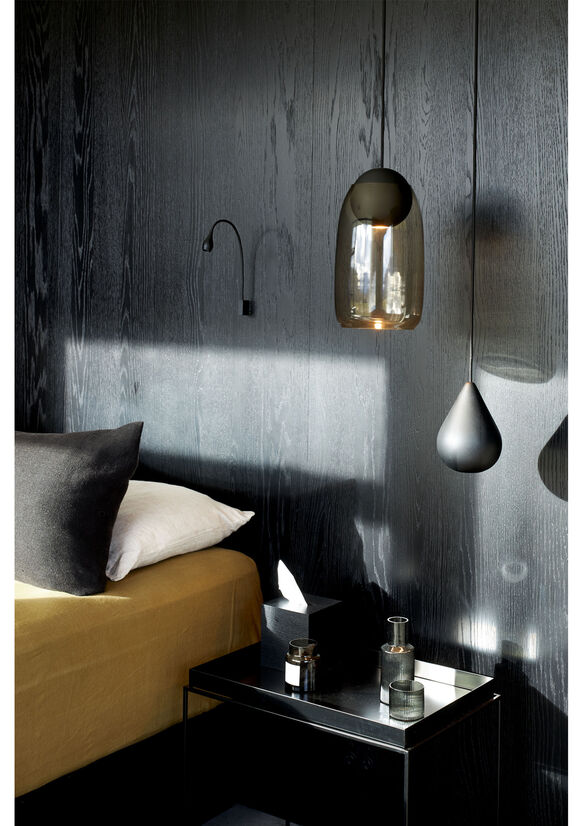 Innovation and creativity are on full display in the kitchen, a vital space for the entertainment-oriented clients. By specifying new-to-market appliances, the kitchen performs with the utmost technology. We were able to eliminate horizontal splits on the blackened oak panels that seamlessly integrate a full-height fridge and freezer and cleverly hide the scullery, creating a sense of scale and wonderment. A downdraft ventilation system was designed to avoid any obstruction of view or conversation in the heart of the kitchen. ECC’s Rhythm Pendant in the dining area acts as both a conversation piece and an evocation of the environment, with its mechanical arms echoing rocky mountain ranges.