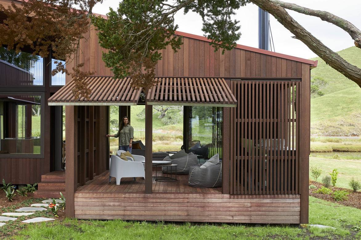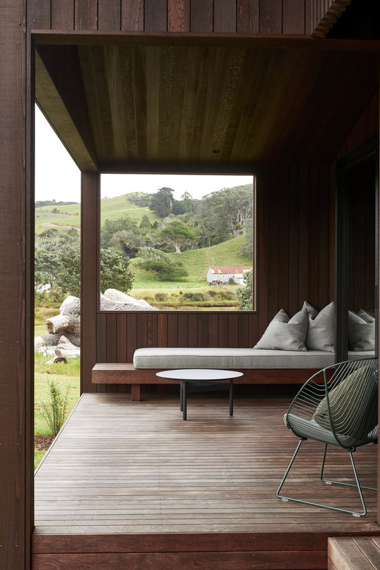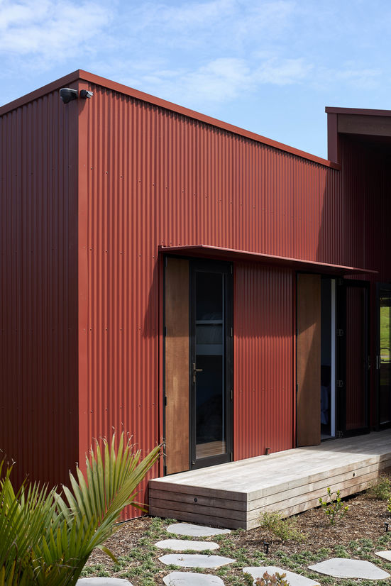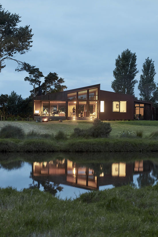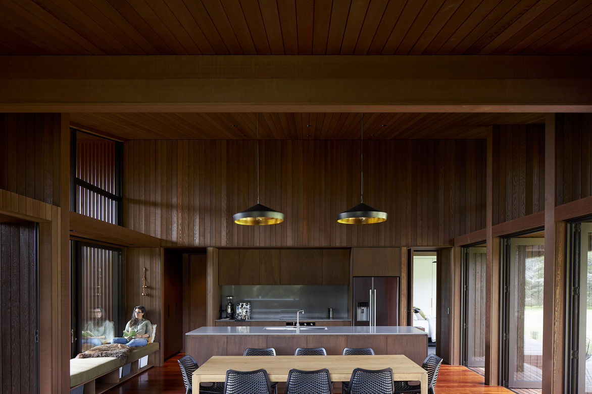The site is subject to strong prevailing north-easterlies and south-westerlies that sweep across the paddocks. In summer the sun can be harsh and relentless. Two distinct zones are brought together under the split gable roof – living to the north and sleeping to the south. The living wing is intricately clad in dark stained cedar, a retreat for the eyes, whilst the sleeping quarters offer respite from the heat of the day, cloaked in a rich scoria-red corrugate. The internal environment responds to the various climatic conditions, large overhangs, cedar under-slatted roofing and electronic actuator screens help to naturally cool, protect and expand the living quarters and offer windward and leeward outdoor living options.