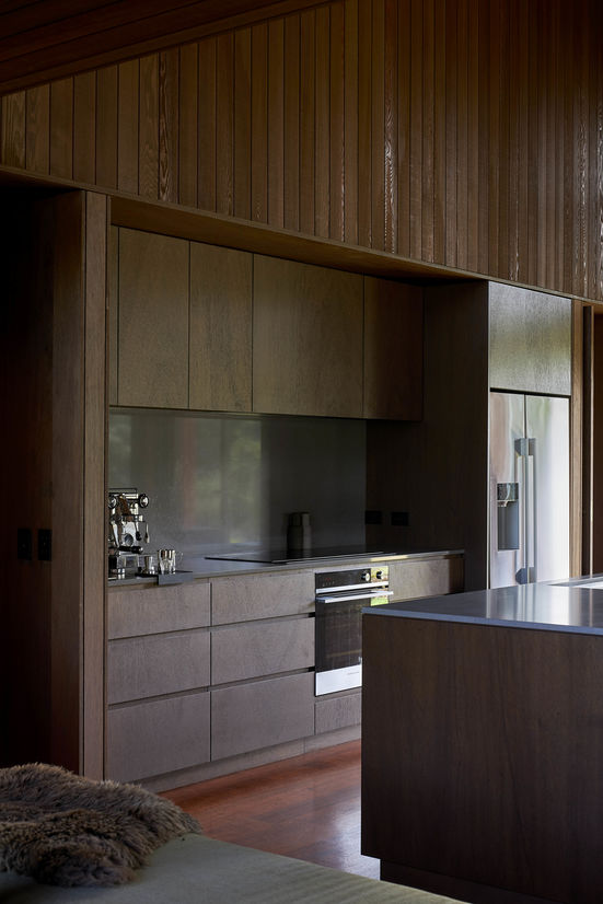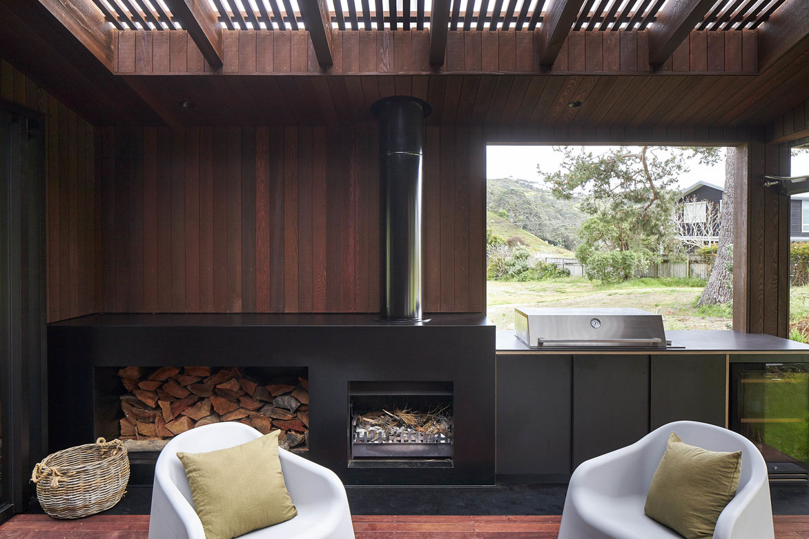 The continuity of materiality from exterior to interior further blurs the boundary between outside and in. A serene palette of kwila flooring, meranti and dark stained cedar soar to lofty heights in the living zones. Extensive built in cabinetry offers a multitude of spots to read a book and slip into an afternoon snooze or act as overflow sleeping beyond the four bedrooms and rumpus when the need arises. Quintessentially, the sheltered outdoor room with integrated BBQ and black steel-formed fireplace can be enjoyed all year round, a place to gather and enjoy our kiwi lifestyle throughout the seasons.