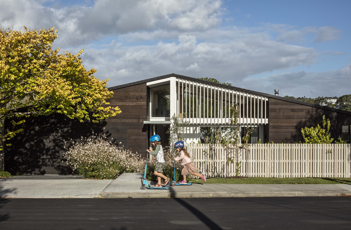 This is a long-term home for a growing family and located in suburban Auckland’s North Shore. The site has a moderate western slope with an eastern road boundary and a double width right of way to the northern boundary. The right of way separation from the neighbouring house allows plenty of unobstructed sun and also access via a public walkway to the local beach reserve.