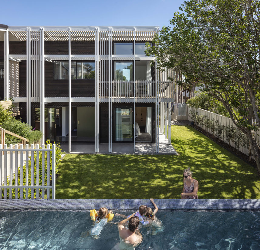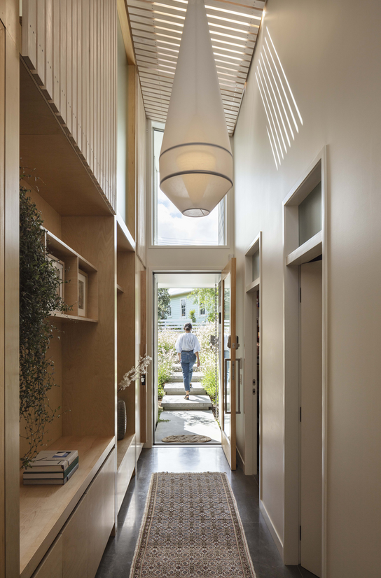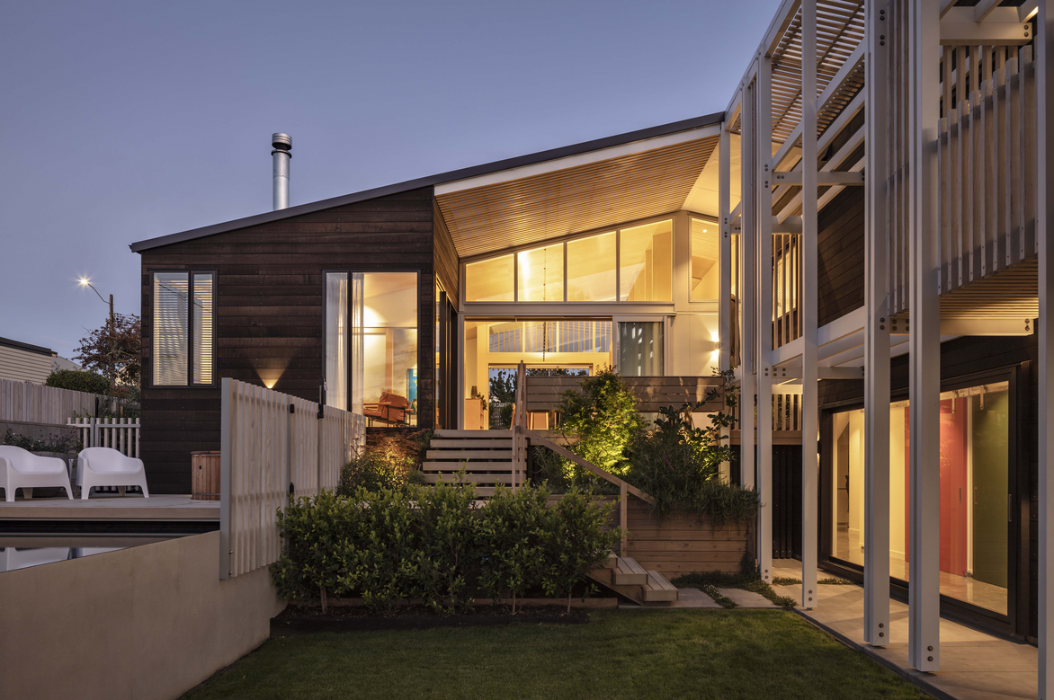 Inspiration for the gabled form and exterior materials has been taken from the ‘California Bungalow’ to help satisfy the Council’s heritage criteria for the zone. Dark stained timber weatherboards and corrugated metal roofing are contrasted with white-washed timber details & shade structures.