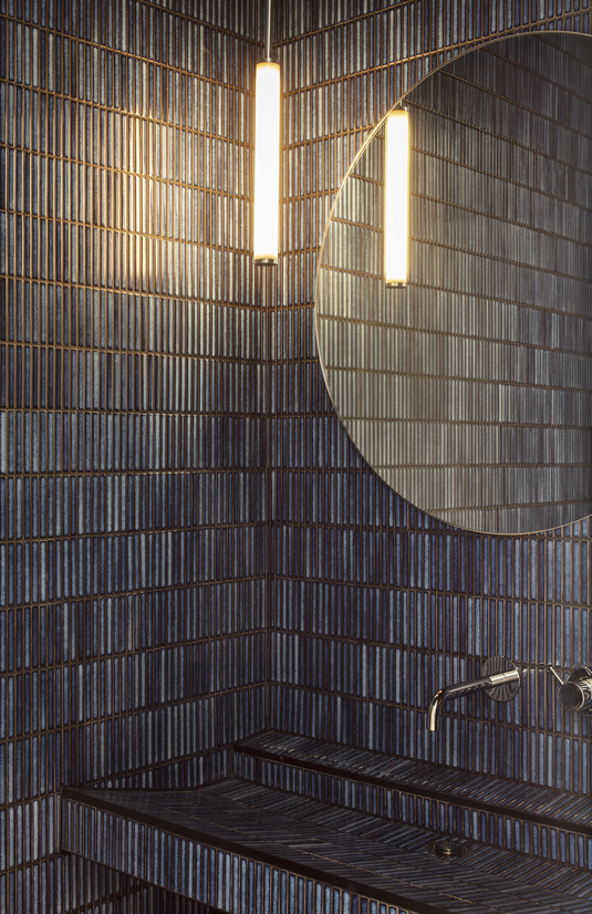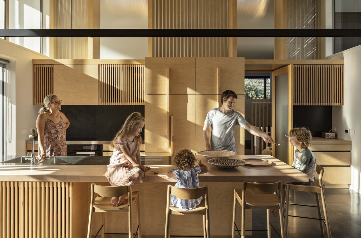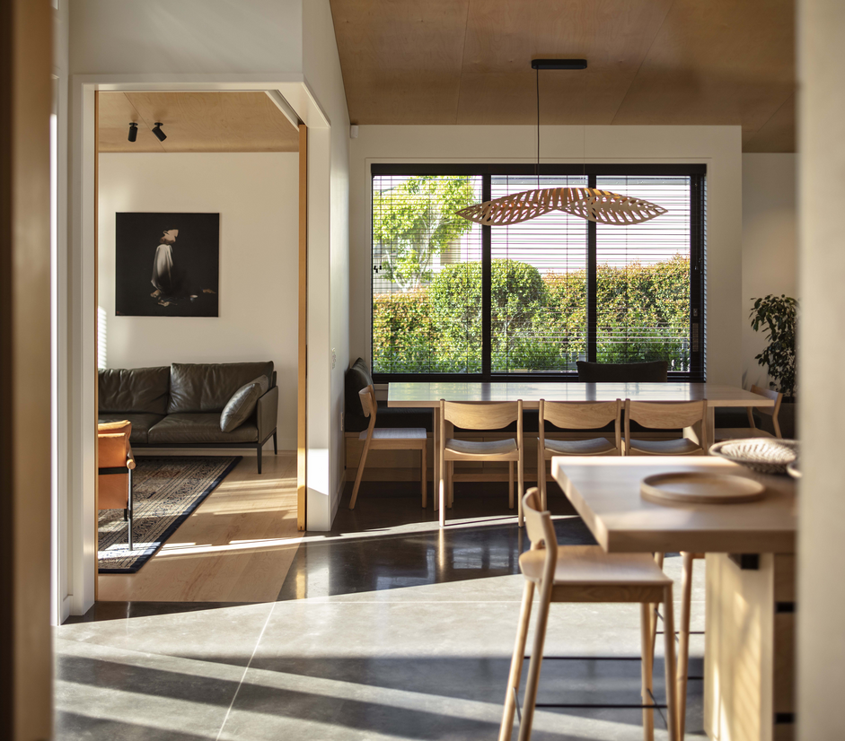 Solid timber & veneered plywood is used internally to accentuate the ceiling plane and extensively in the cabinetry and built-in furniture.