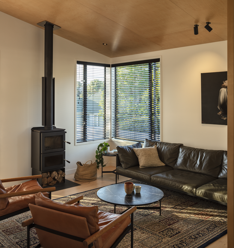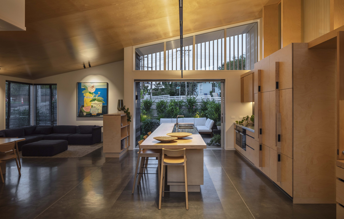 Living spaces, housed under the main gable, provide options for connection to each other and to the outdoors. The transparency through the main gable maintains a connection from the street through the east terrace, open plan kitchen and western deck to the Puriri at the rear of the site.
