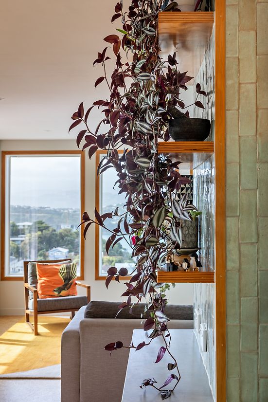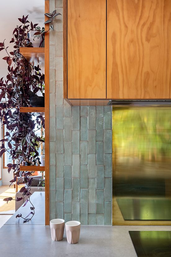 Handmade sage green mosaic tiles were used throughout the room along with textured wool seating upholstery to bring nature indoors as the colour echoed the green of the harbour sea visible from the living room.