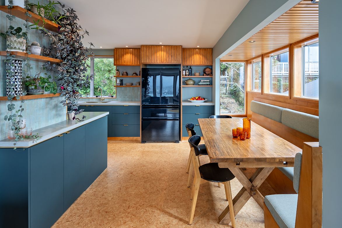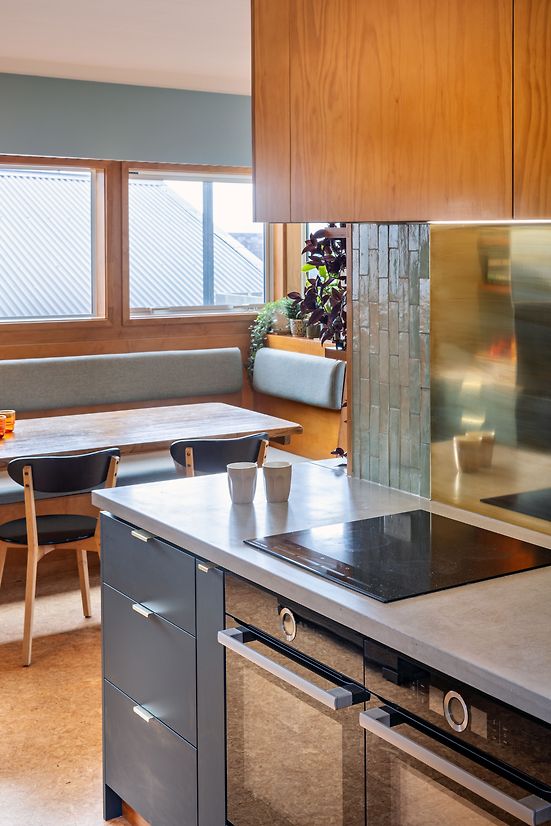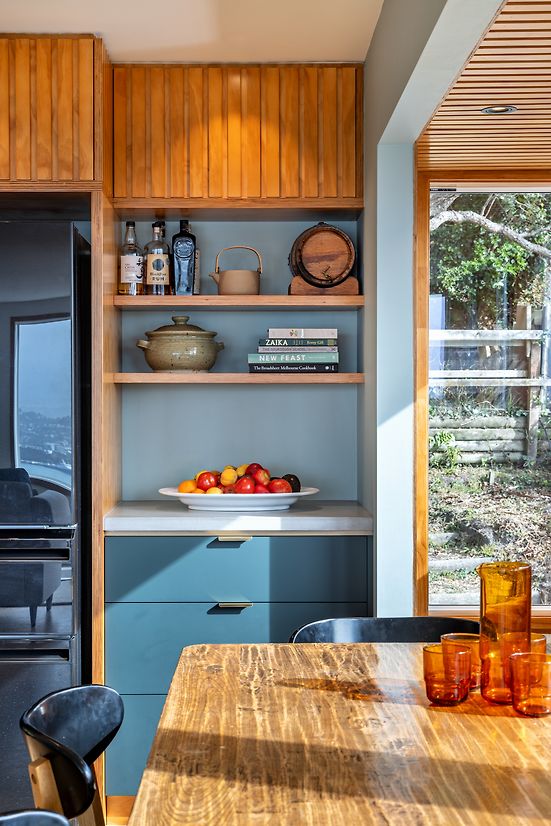 Plywood slatted ceiling echoes the slats used on cabinetry to help frame the dining alcove and contribute towards making it feel intimate.