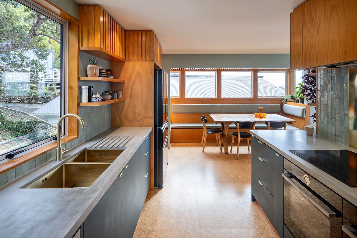 The Rakau Rd Radiant Harbour Haven kitchen renovation aimed to transform a small space into a functional and aesthetically pleasing culinary haven on a modest budget. The design incorporates colours and textures that resonated with the clients who is a family with 3 children 5-10 years of age. Dark green cabinetry, plywood timber joinery, handmade concrete organically finished benchtops and brass accents to create a warm, organic ambiance that echoes the surrounding exterior views of a harbour, forestry, and green vegetation in the hillside garden. A custom designed dining space alcove was fitted into the kitchen area to encompass social connection between the family and hangers on whilst doing homework and meal preparation. PureMatte HPL laminate with anti-microbial properties in a smooth matte dark green colour combined with light grey handmade sealed concrete benchtops offer durability and make for a sophisticated yet organic look. Plywood timber joinery and x-Board flooring warmed up the colour scheme when used in conjunction with brass accents via the handles, sink, tapware and splashback. Practical materials for longevity and ease of cleaning. Handmade sage green mosaic tiles were used throughout the room along with textured wool seating upholstery to bring nature indoors as the colour echoed the green of the harbour sea visible from the living room. Plywood slatted ceiling echoes the slats used on cabinetry to help frame the dining alcove and contribute towards making it feel intimate. The original kitchen was in a slightly smaller footprint and did not make the best use of the space from a functional perspective as the kitchen benches were narrow, cupboards instead of drawers were used and bulky deep overhead cabinets closed the existing space in. There was no joinery or benches used in the pantry alcove so this space was maximised to accommodate the food storage, benchtop appliances and needs of a growing family. As there was a lack of wall space the ovens were kept under the bench but adjacent to the hob so easy access could be achieved. The hob bench wrapped around into the landing area into the kitchen so that it invited visitors into the kitchen space and served a need as display area. Access to the house was tricky with stairs and no lift/cable car so a lot of joinery items were assembled onsite. A unique kitchen that differs from the usual palette of colours and textures currently in fashion whilst retaining functionality within the NKBA design guidelines has been achieved – this family adore their new space and intend to enjoy it for another 10-15 years.