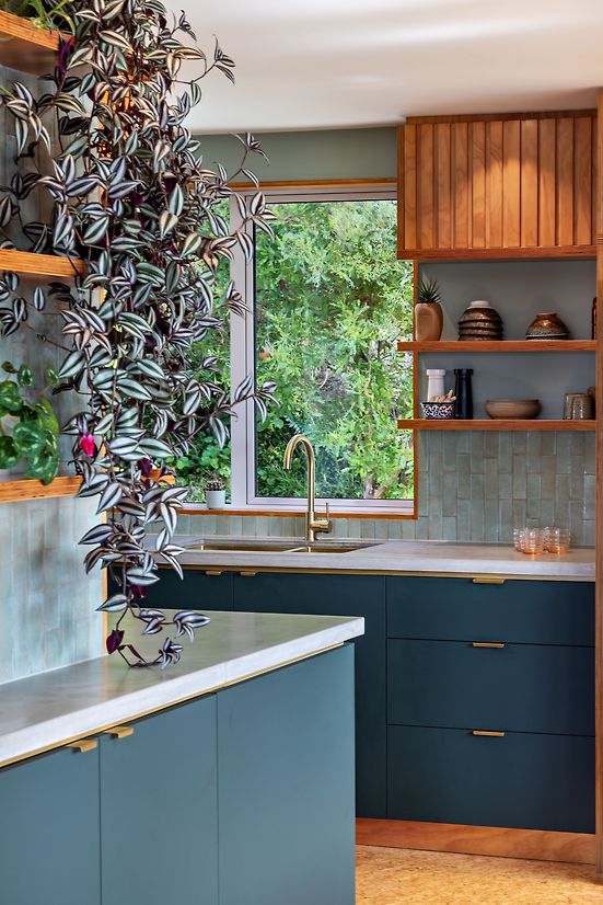 The Rakau Rd Radiant Harbour Haven kitchen renovation aimed to transform a small space into a functional and aesthetically pleasing culinary haven on a modest budget. The design incorporates colours and textures that resonated with the clients who is a family with 3 children 5-10 years of age. Dark green cabinetry, plywood timber joinery, handmade concrete organically finished benchtops and brass accents to create a warm, organic ambiance that echoes the surrounding exterior views of a harbour, forestry, and green vegetation in the hillside garden.