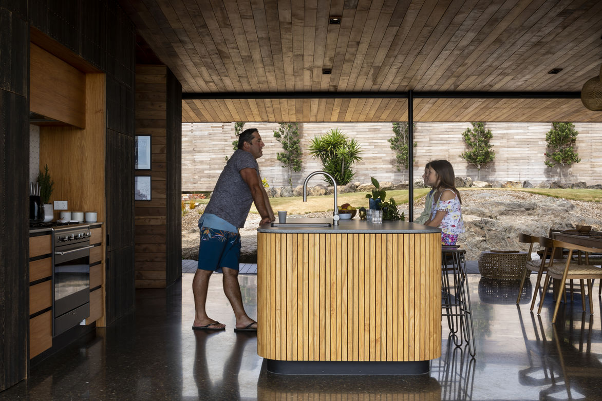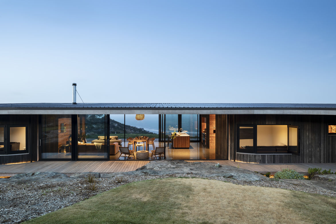 The three pods that shelter under the sweeping roof plane create framing points where views are orientated to the North (sea) and to the South (Ports Hills).