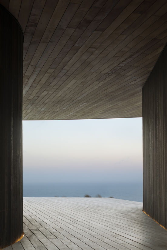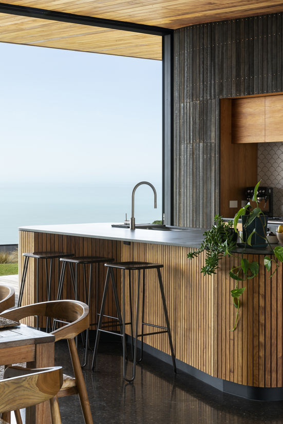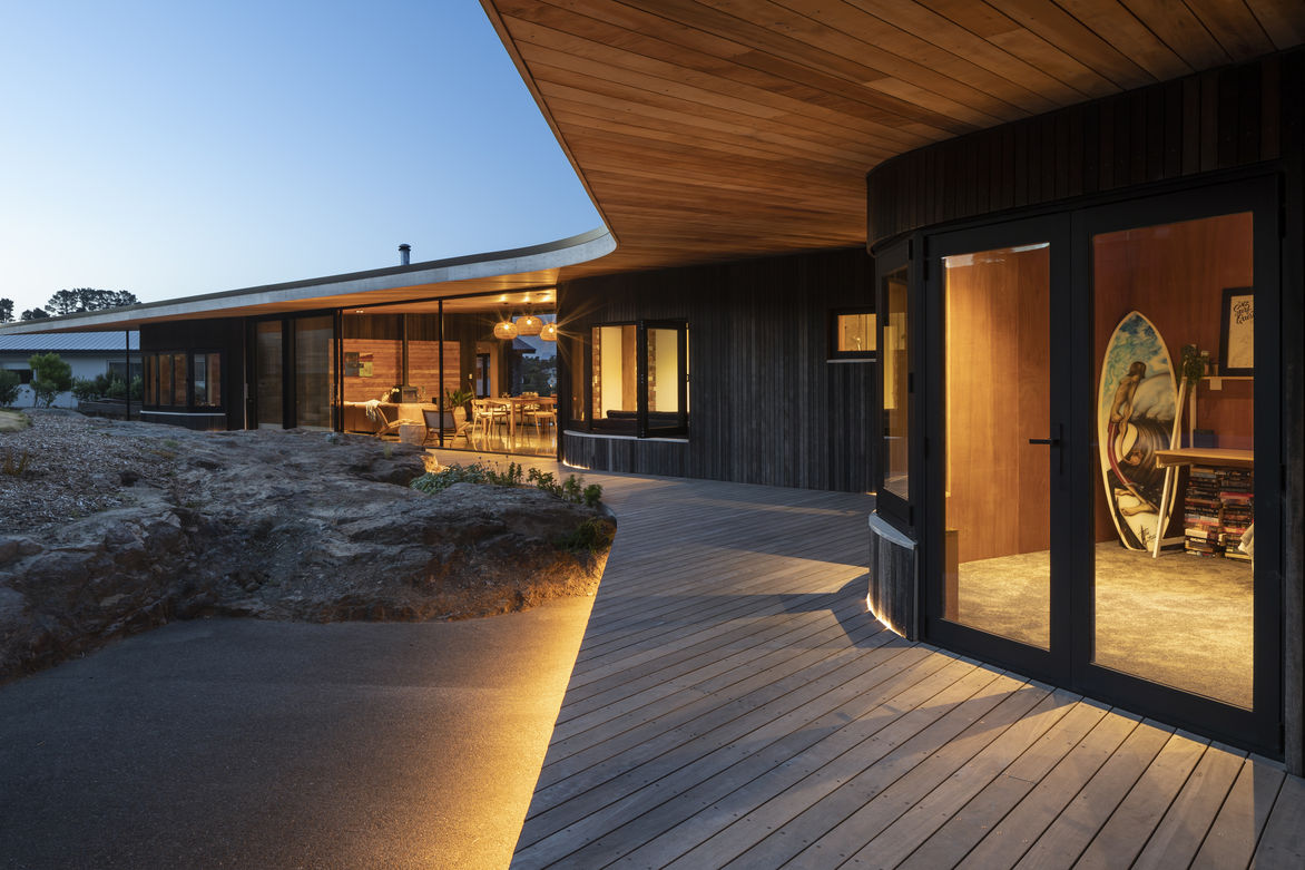 Set on a hill with panoramic ocean views, this family home is comprised of three curved pods that create enclosures for bedrooms, bathrooms and garage spaces, with a large, open living space between. A floating deck wraps around the house, integrating it with an exposed rocky outcrop, and is sheltered by a hovering roof. Recycled brick linings intensify the sense of enclosure in the bedroom pods, while fully glazed walls create an expansive sense of openness of the living area. The generous curves of the building shelter outdoor living areas from prevailing winds.