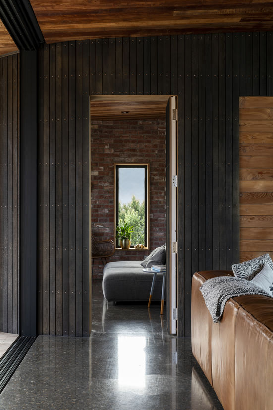 Material selection for our house was discussed & debated at length and was an important design aspect for us. The different timber cladding used on soffits, walls, and deck were carefully chosen to work with the colours found within the surrounding landscape and to provide a sense of warmth, human scale and contrast within the spaces. The different timber selections also allowed us to play with textures & colours that changed with the play of light through the day and through the seasons creating surfaces with an inherent dynamic nature.