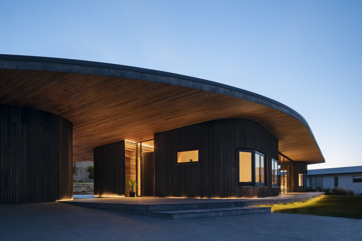 The sweeping roof form and the curved pods combine to create ‘sheltered’ and ‘open’ spaces to live amongst. The roof line comes up from the ground plane to the south to sail over the living pods and the open spaces that are created in between the pods provide an open central living area that connects to the views to the Southern Ocean and Port Hills.