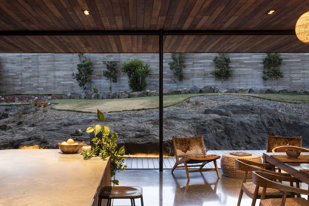 The rear of the house sits into the landscape with the roof and deck hugging the existing volcanic rock seams to provide a series of different spaces to occupy. The eves provided by the roof provide very specific orientated shading to achieve passive solar gains.
