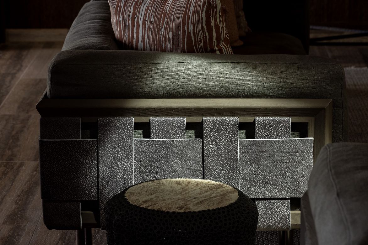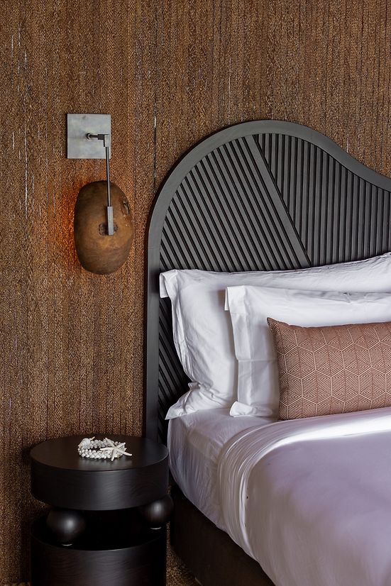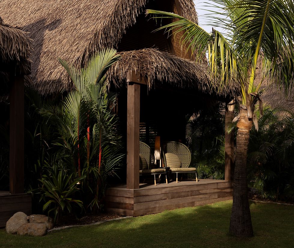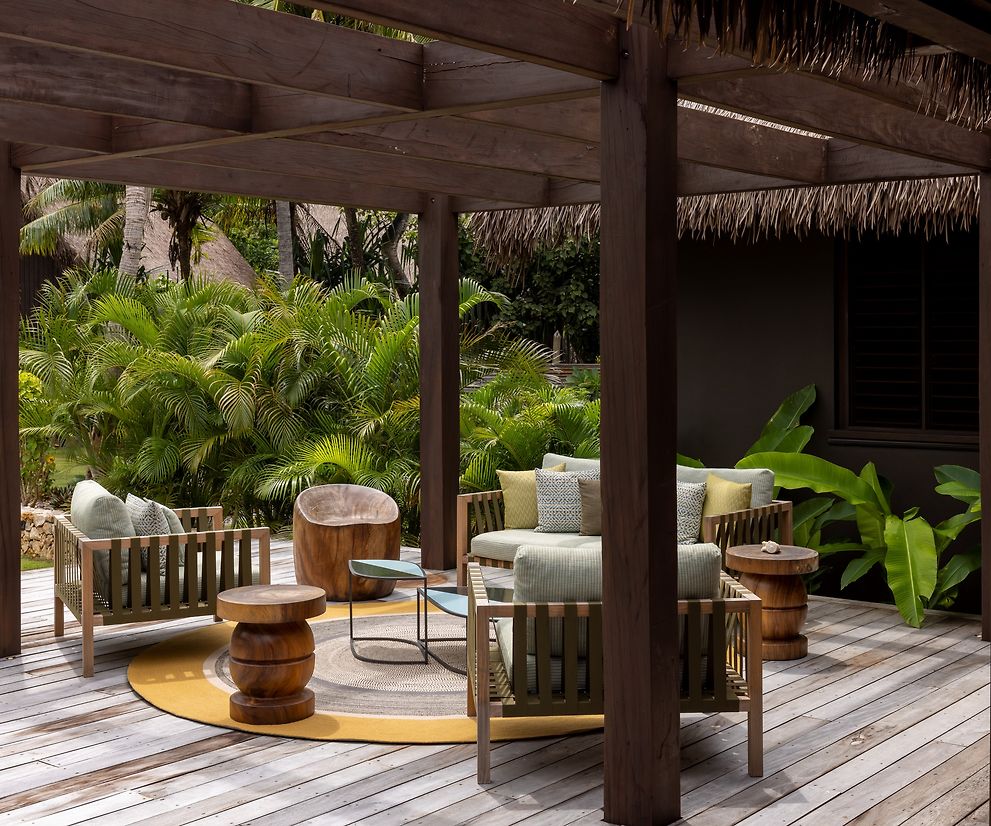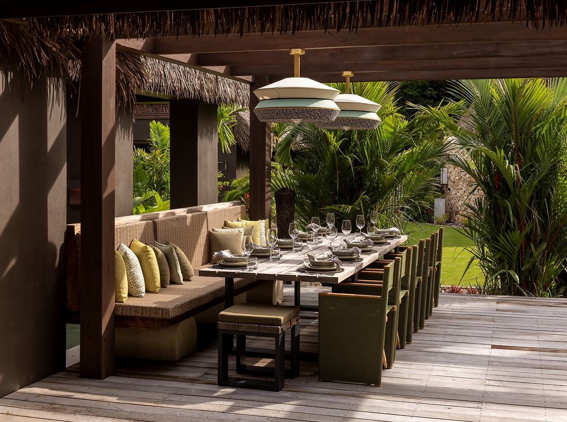 It was important that the house reflected its Fijian locale and to this extent we engaged local artisans and designed several bespoke pieces for the home. Working closely with local artisans and locally available materials, allowed the custom elements to be designed, and executed through close collaboration to seamlessly integrate into the furnishings, lighting & cabinetry throughout. Twin benches align each side of the entrance loggia, the artisans hand seen in the carving, as well as in the soft, rustic nature of the turned raintree tables which adorn the outdoor spaces. Combining carefully curated contemporary fittings with textured natural elements give a rich layering to this residence.
