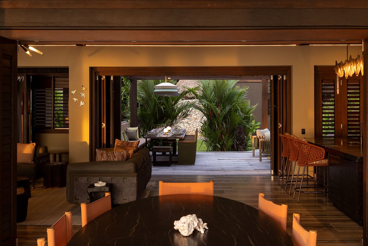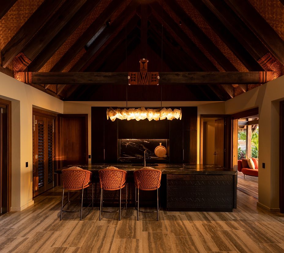 The residence blends modern luxury with traditional island sentiment, a muted palette of luxurious base materials, grounds the home within the environment, highlighting the natural tones and textures prevalent in Fiji. Furniture, soft furnishing, and lighting, bring rich colour to the forefront reflecting the homes positioning between beachside sunsets and luscious tropical forest. Weaves, carved details, and textures further celebrate the local vernacular, with the home embodying tropical opulence. The home offers every opportunity to immerse oneself in the lush natural surroundings throughout the span of the day, across a well-balanced mix of social and private spaces, both indoor and out.