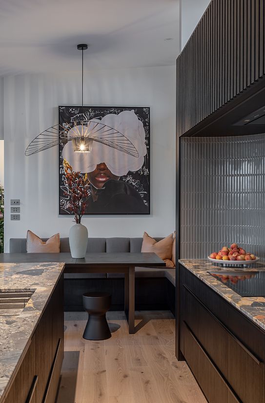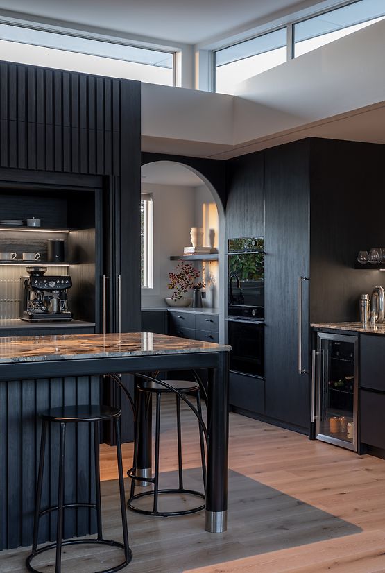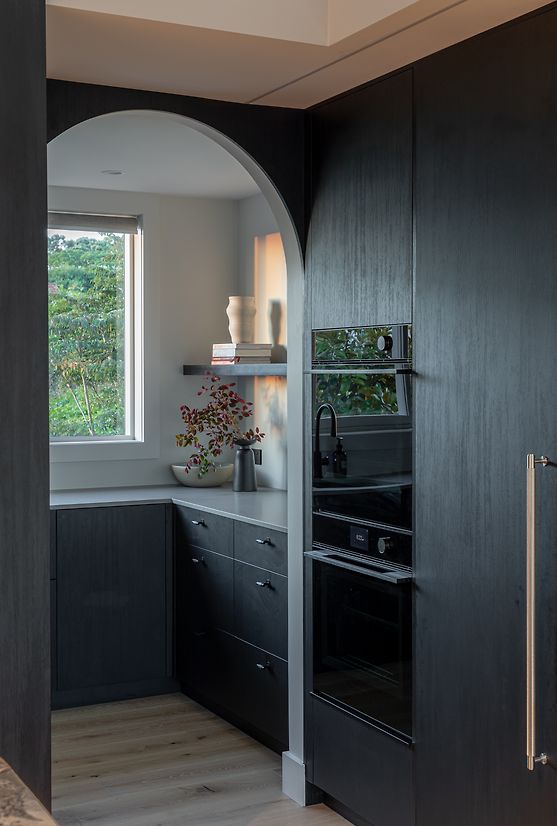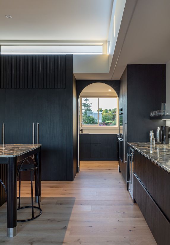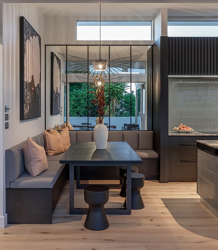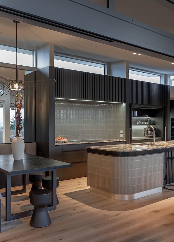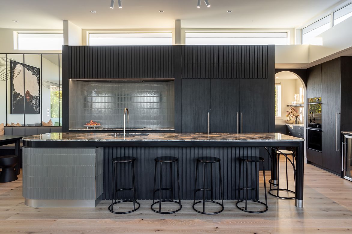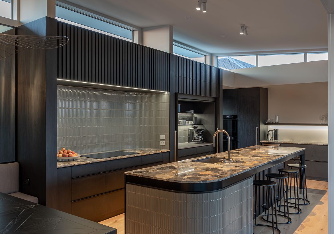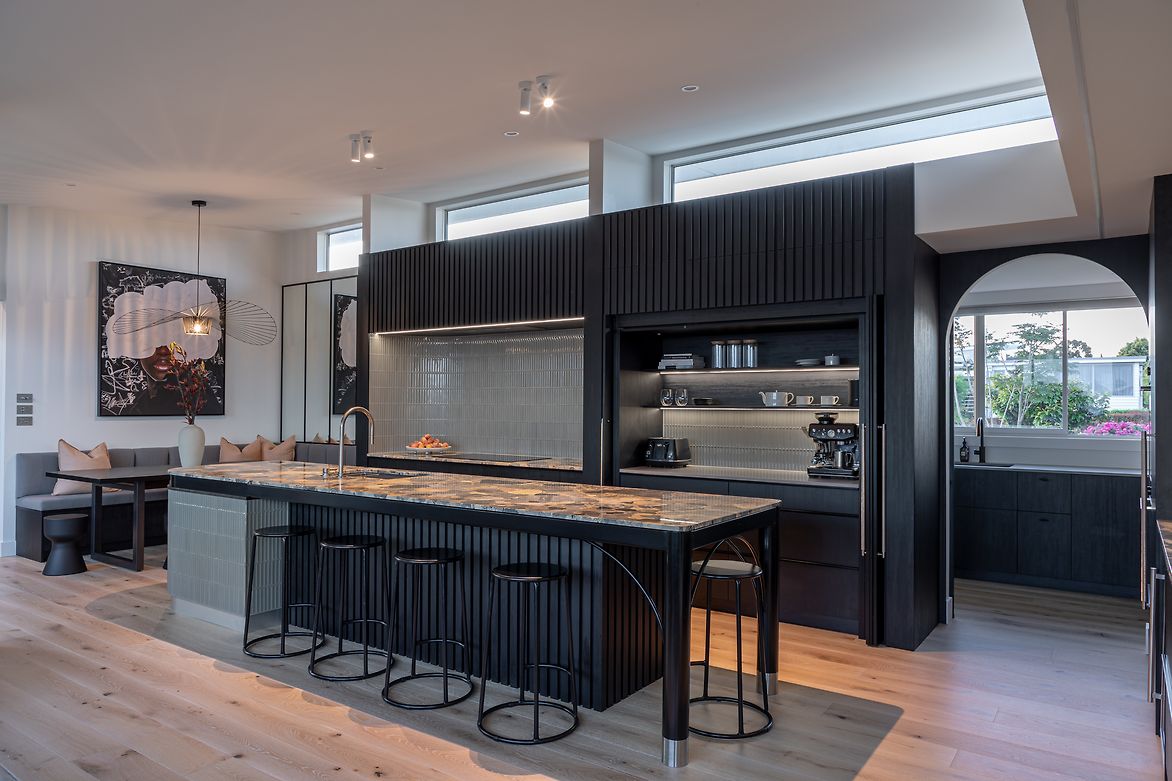 We were involved from the beginning of the renovation, initiating the design process and spatial layout, and engaging the trades through construction. Top of the wish list was the addition of a scullery, plus making the island area a more functional space and the hub of the home for their young family. This involved a complete rethink of how the top floor was laid out. The new scullery utilises a space previously used as a second lounge, which they didn’t need. Extending a wall allowed for a longer ‘back wall’ in the kitchen. The island's location was moved away from the pinch point between the deck and the back wall, which was preventing it from being utilised as a seating space. The new banquet seating/dining created a connection between the kitchen and the adjacent outdoor entertaining area, and a feature mirror wall reflects views of Rangitoto Island, making the room feel larger and emphasising the home’s beautiful coastal location. The ovens are conveniently located so they could be used from the both kitchen and the scullery area. Other services had to remain where they were, as the rangehood extraction through and external wall couldn’t be moved – and the clients wanted it that way. For both these reasons the conventional ‘triangle’ could not be achieved. Part of the brief was to create a statement kitchen – to be bold and unique. The Ceppo marble was the starting point, adding soft peachy and blush tones to the monochromatic design and strong architectural lines. The addition of curves softens the space and makes it easier to move around.
