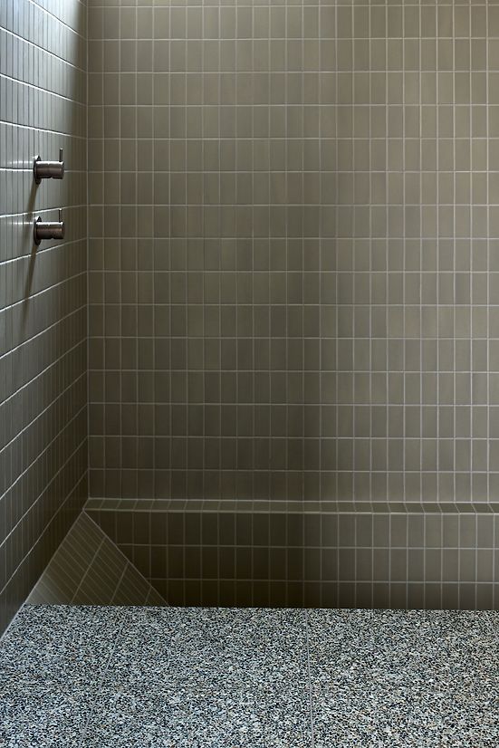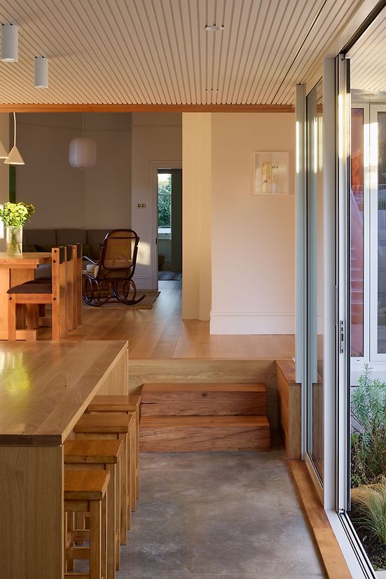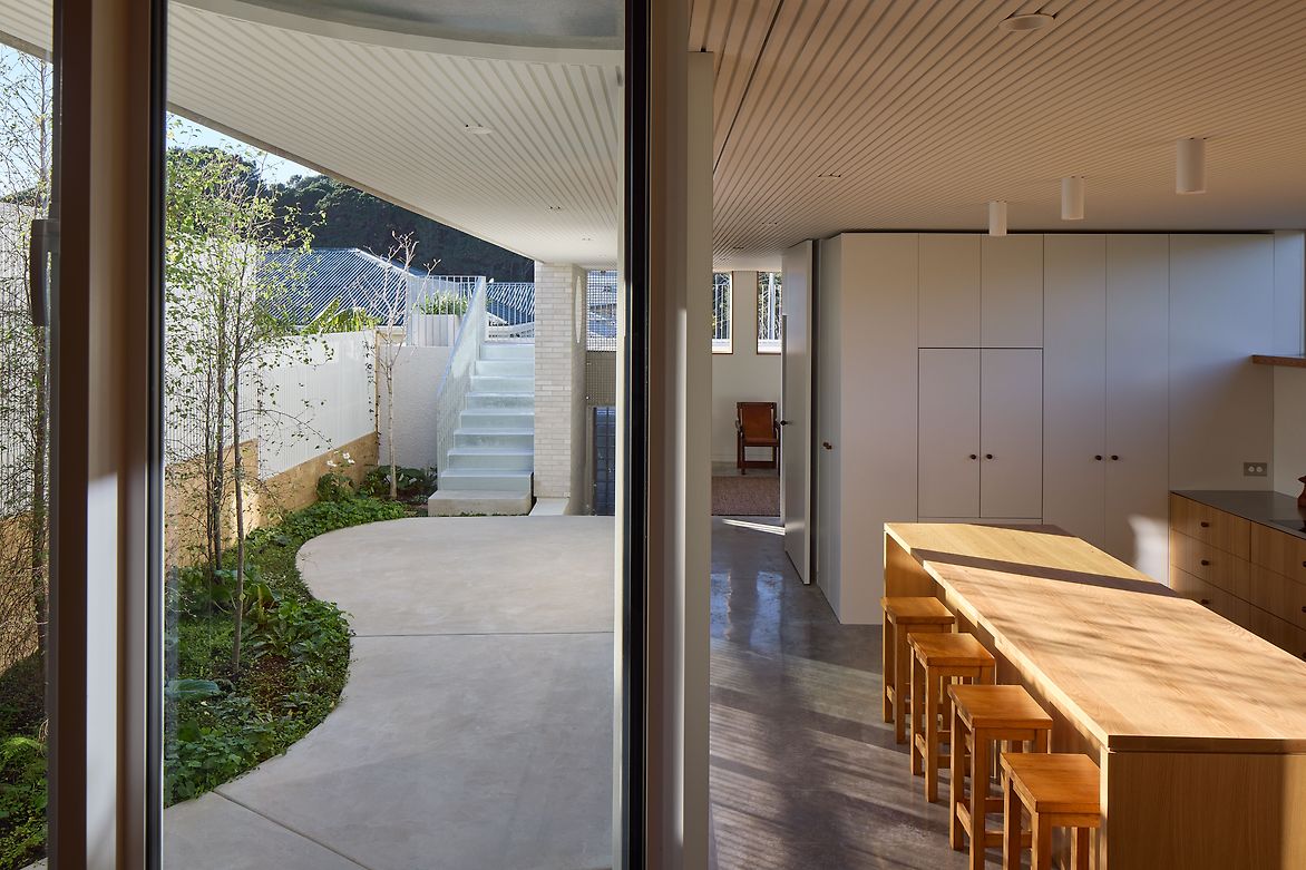 The restored villa retains its character, while a contemporary masonry extension introduces a kitchen, courtyard, bedroom, ensuite, pottery studio, and roof deck. By building to all boundaries, the house forms a robust outer shell sheltering a sequence of increasingly light-filled spaces centred on a sheltered north-facing courtyard. A 30-metre east-west axis visually connects the site’s extents, unfolding as a string of rooms along the southern street edge. These spaces gently transition from old to new, with apertures modulating privacy, openness, and flexibility. Split levels create dynamic vantage points and intimate retreats—such as a curved bathroom vestibule or moody bathing spaces—within an efficient, flexible plan that accommodates expansive communal zones and cosy corners. For example, the long space can be shortened and closed down at each end with doors, increasing privacy within the house during nights or colder seasons